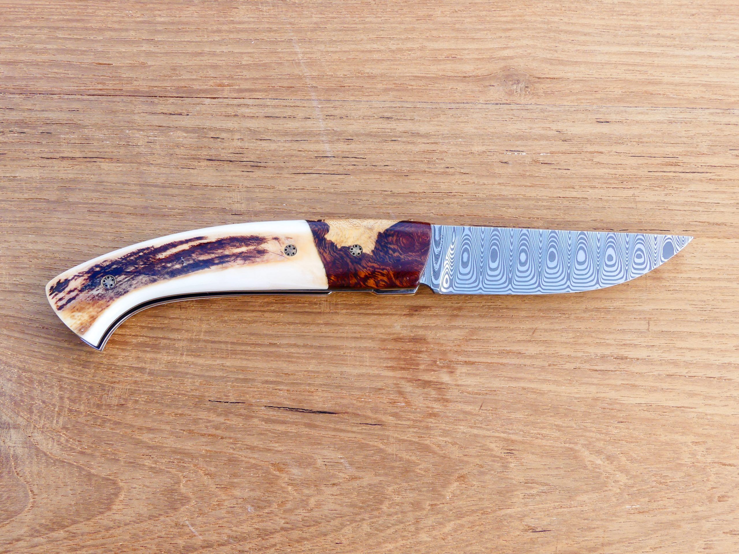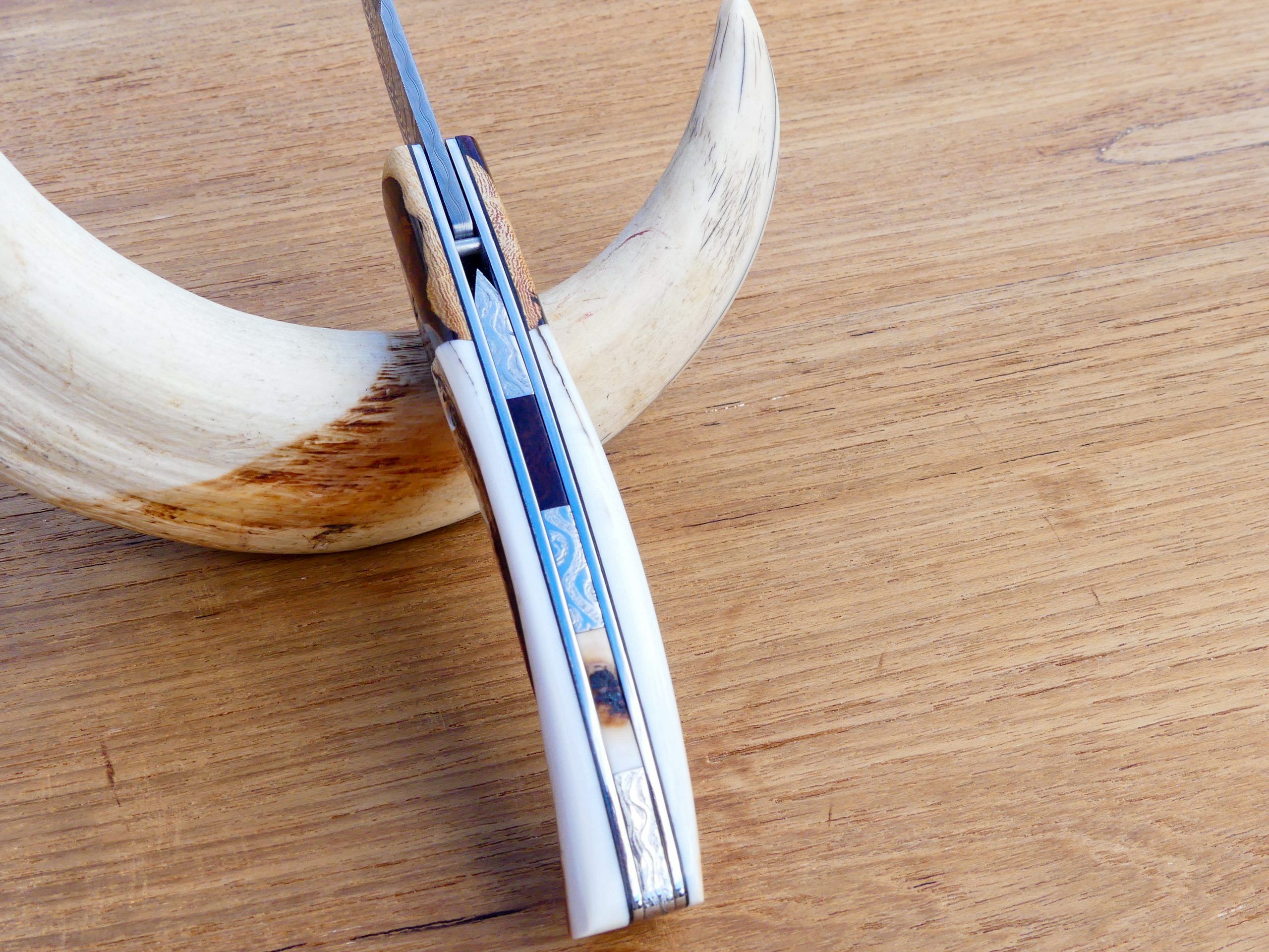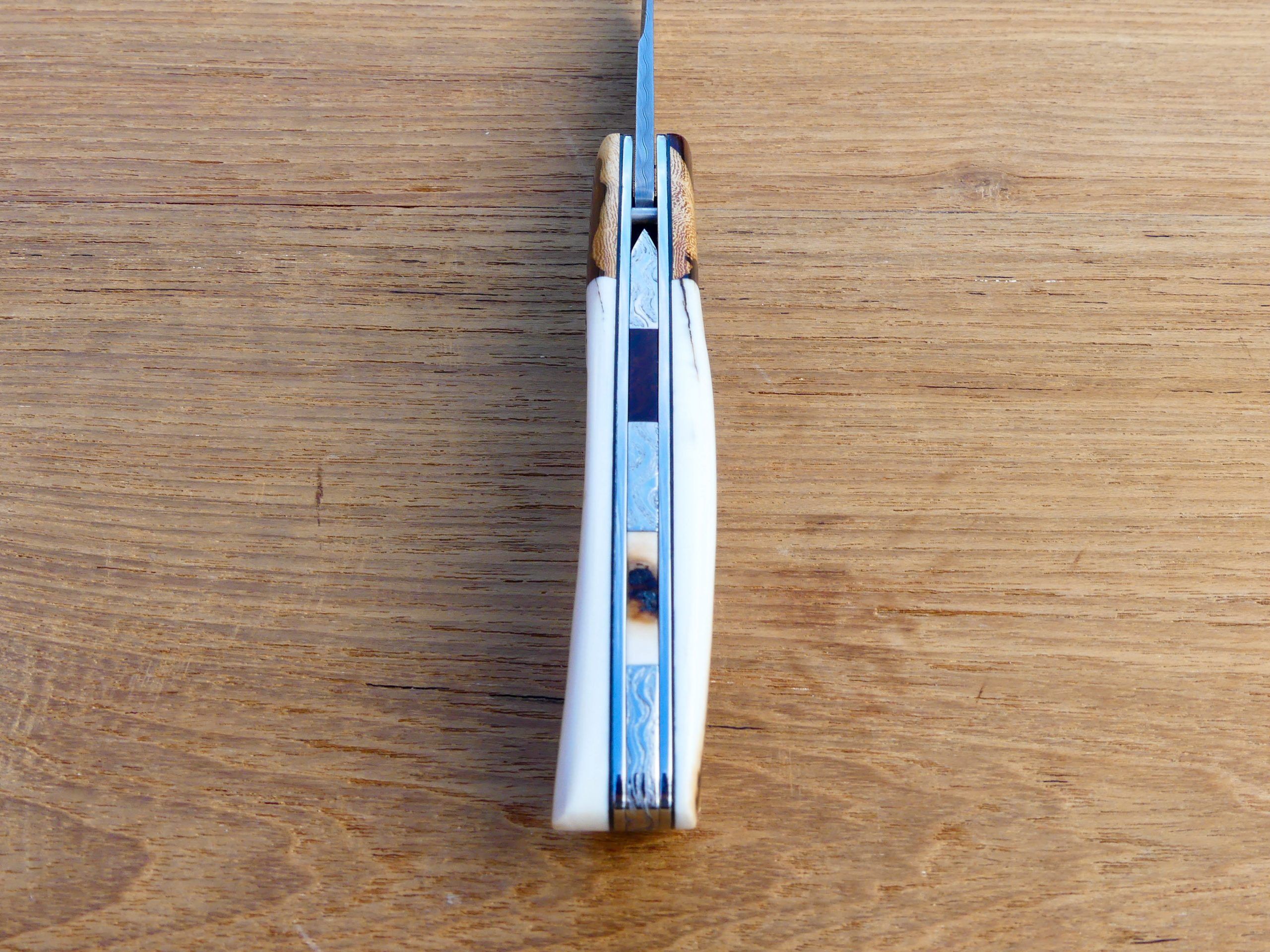 La lame est en Damas inox 288 couches avec contre-tranchant nogentais.