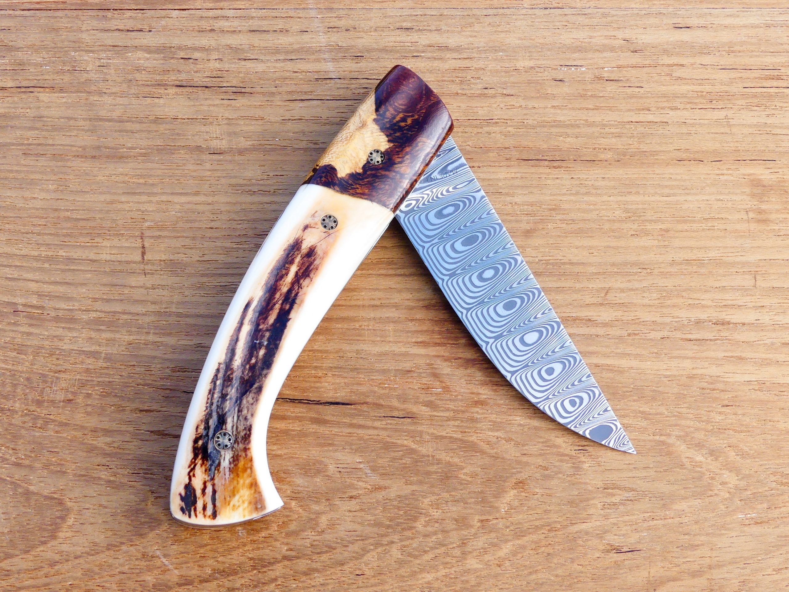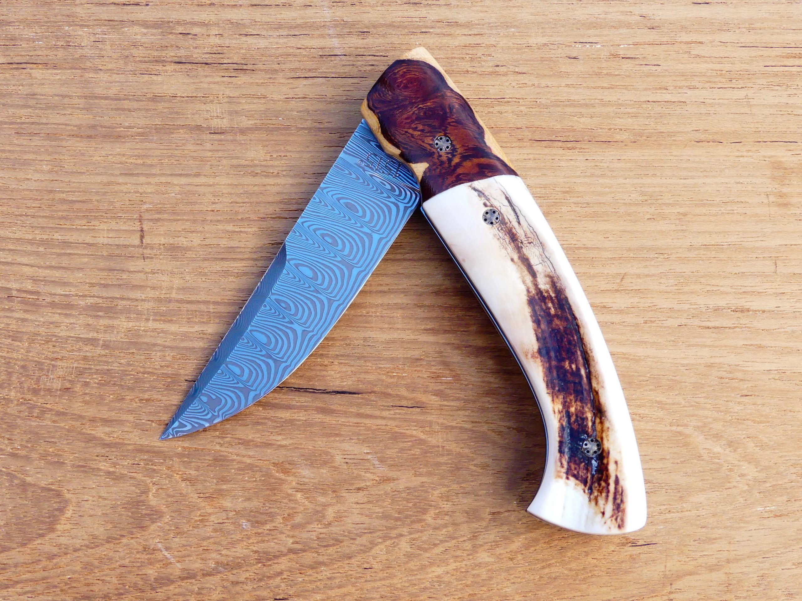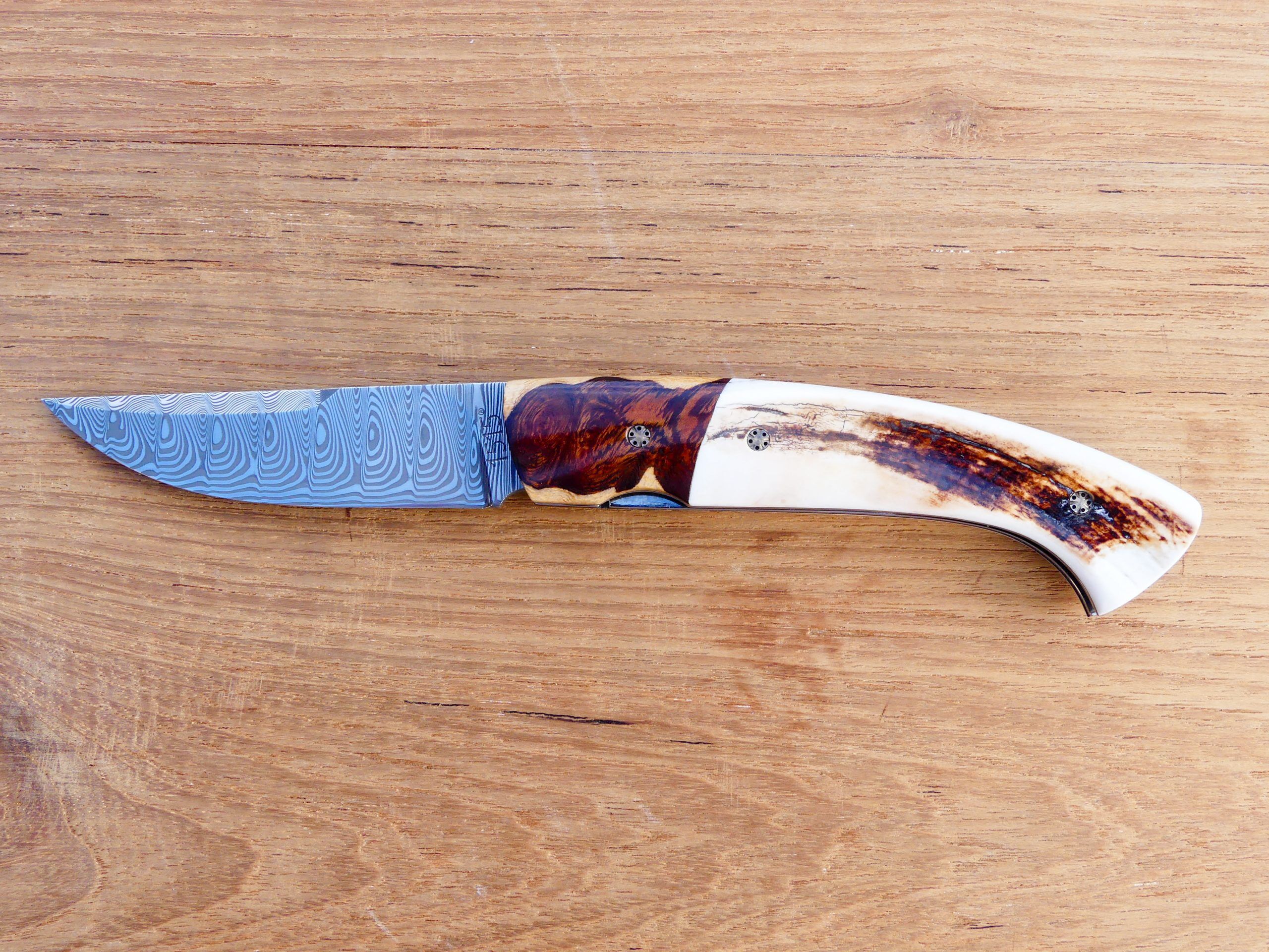 La lame est en Damas inox 288 couches avec contre-tranchant nogentais.