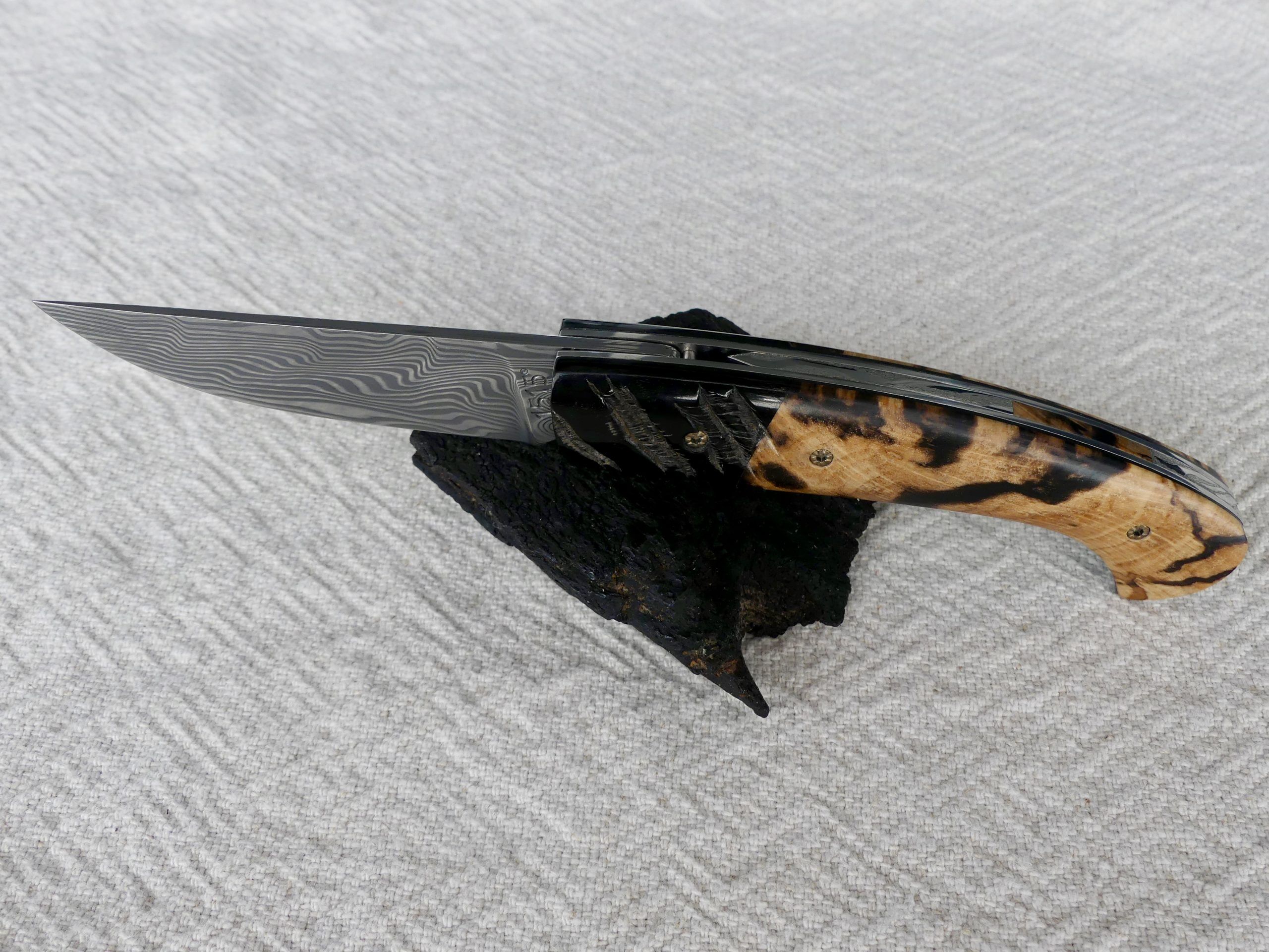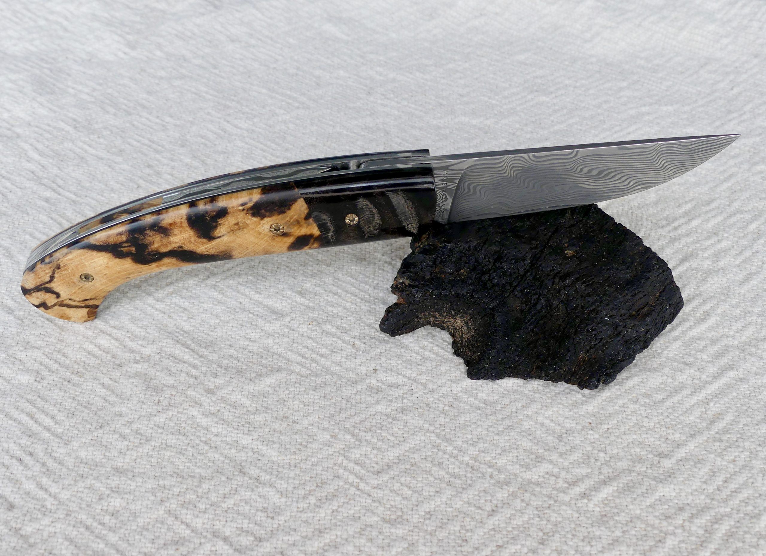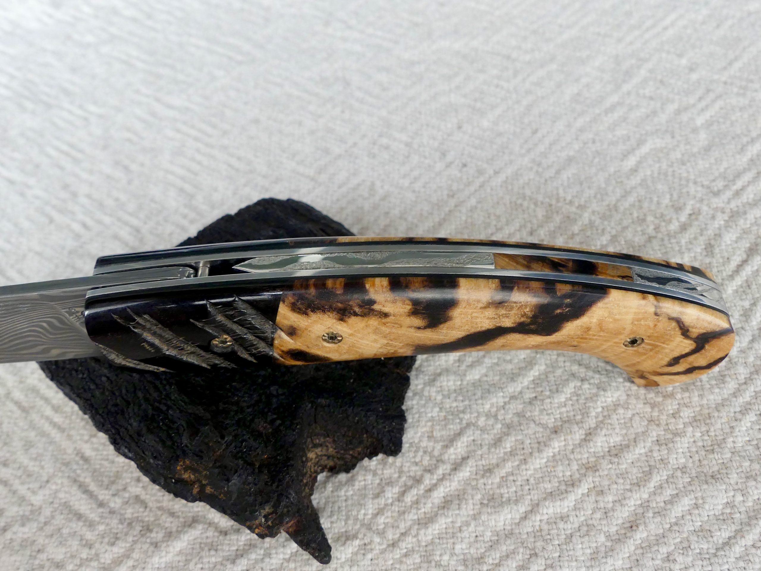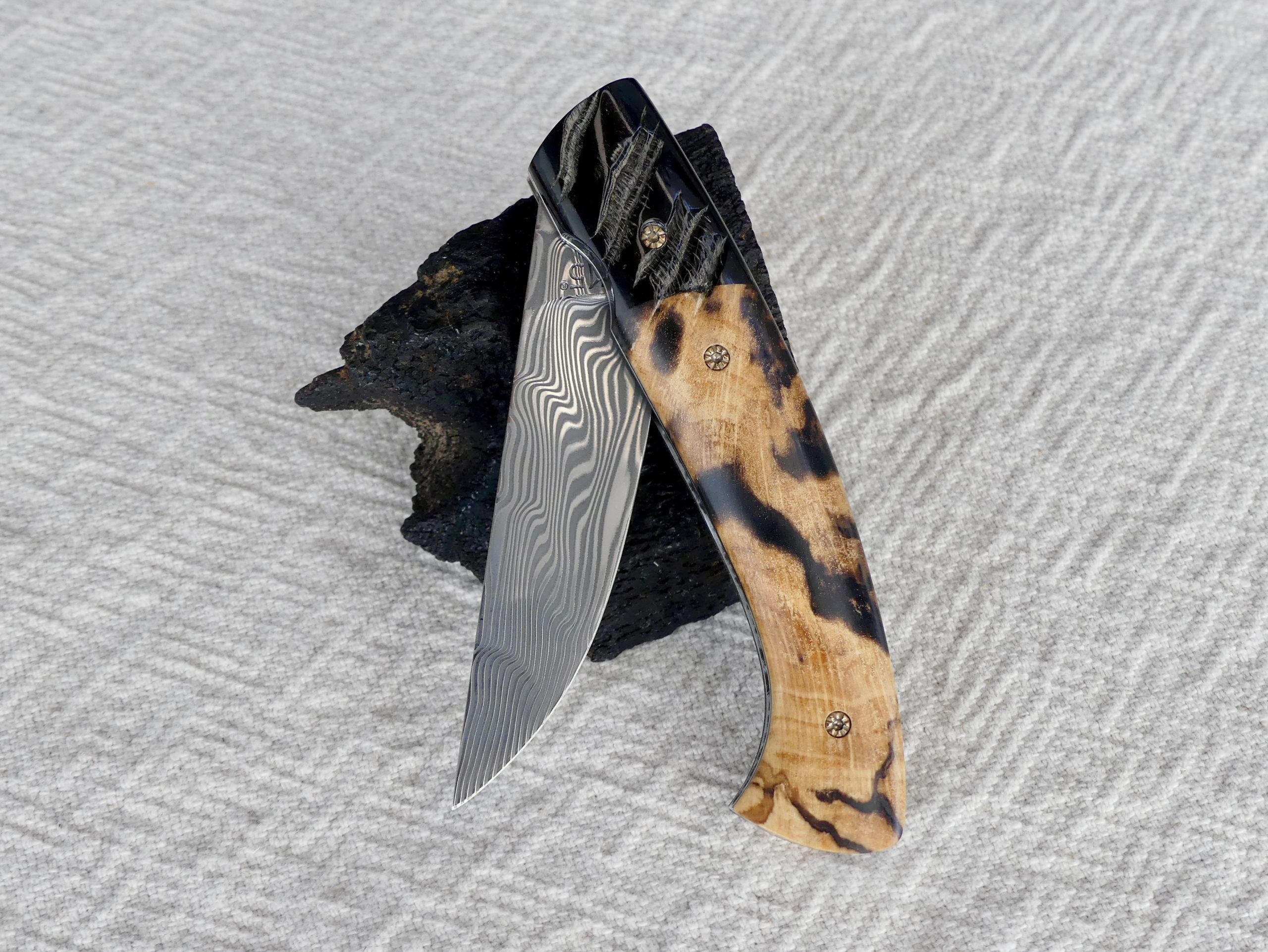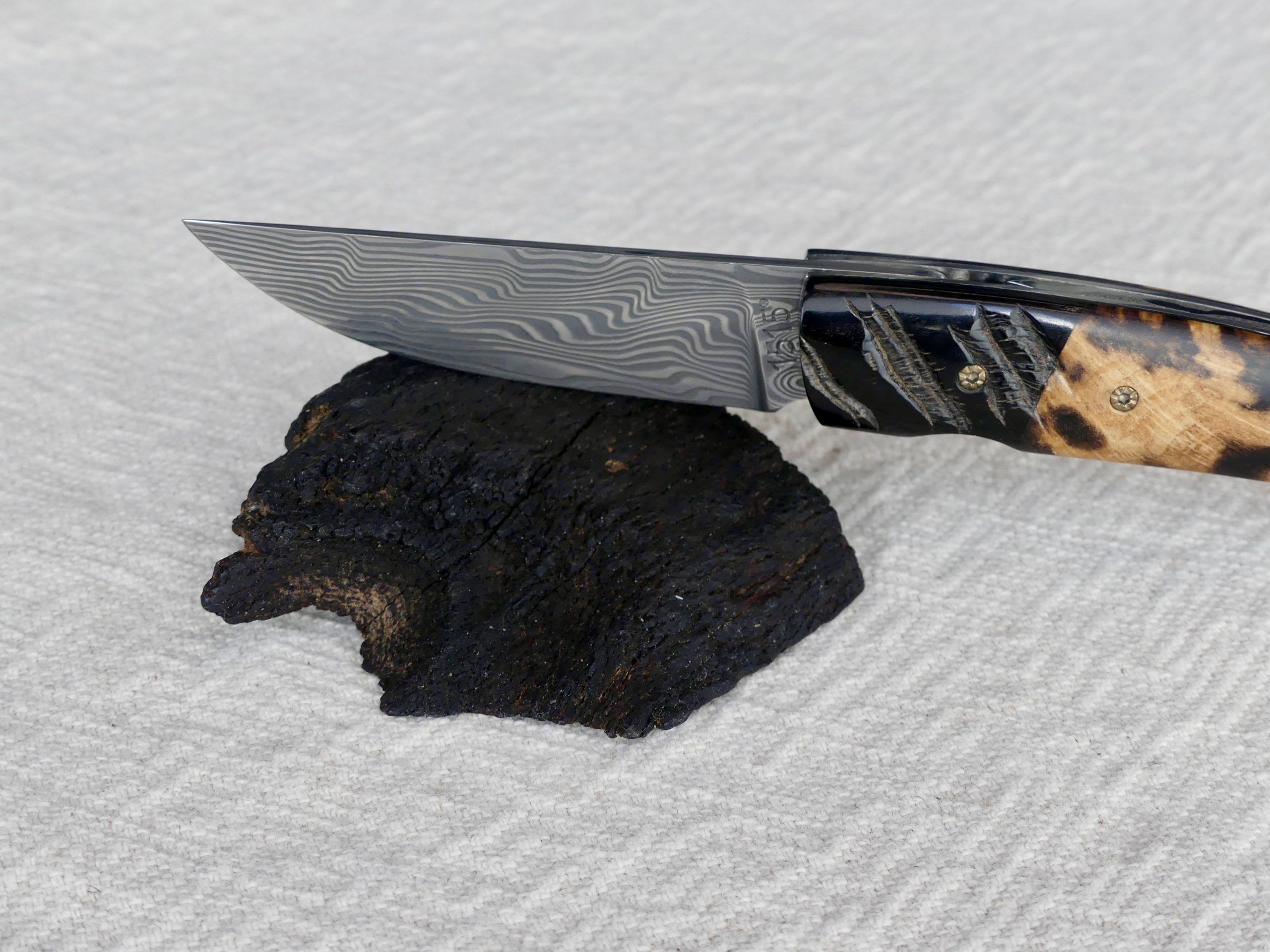 Couteau pliant à système liner lock, il associe une mitre en buffle à un corps en platane échauffé. Ce mélange de corne et de bois crée un contraste naturel et chaleureux.