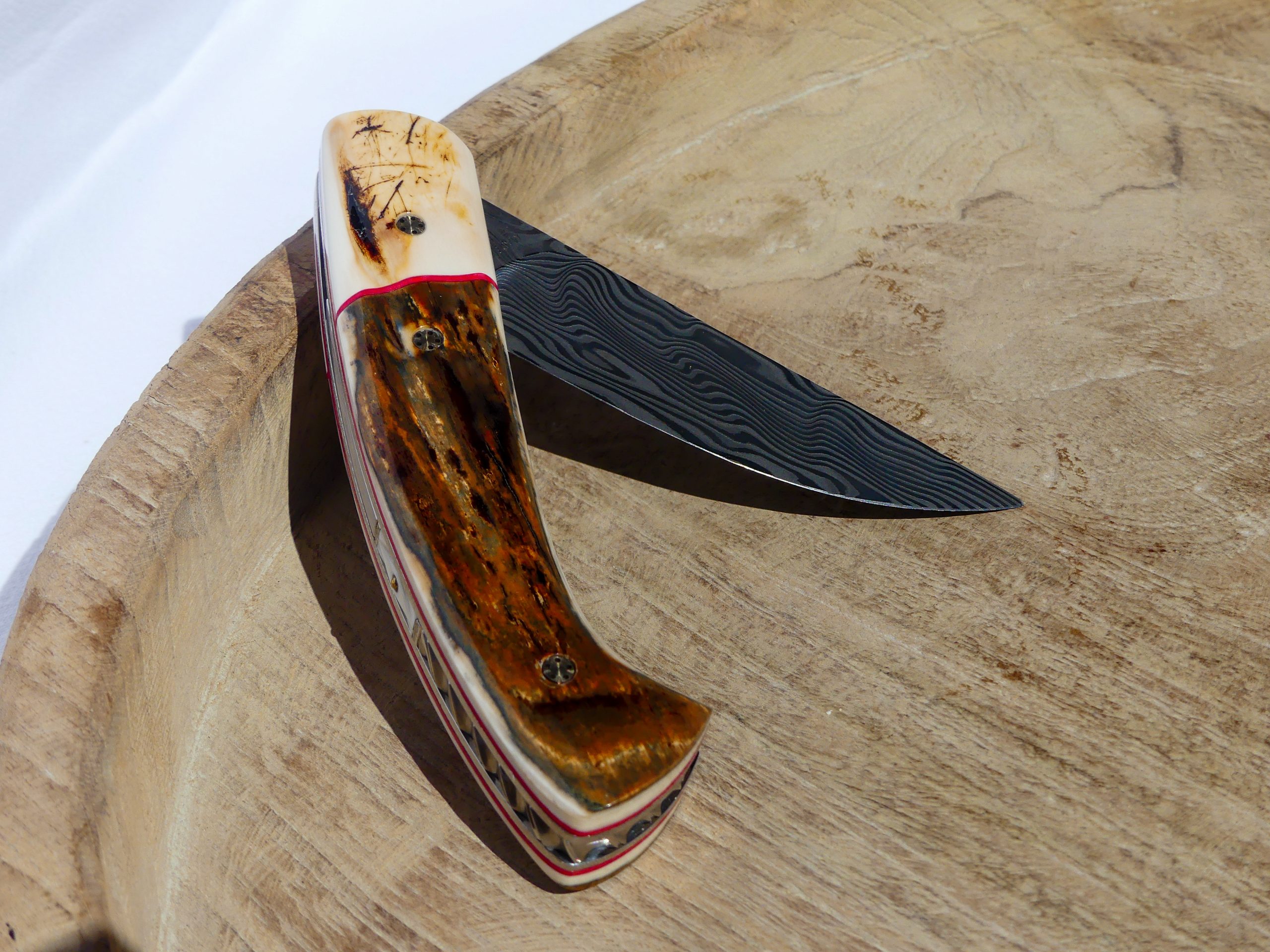 La lame est en damas inox de 288 couches avec un contre tranchant Nogentais.