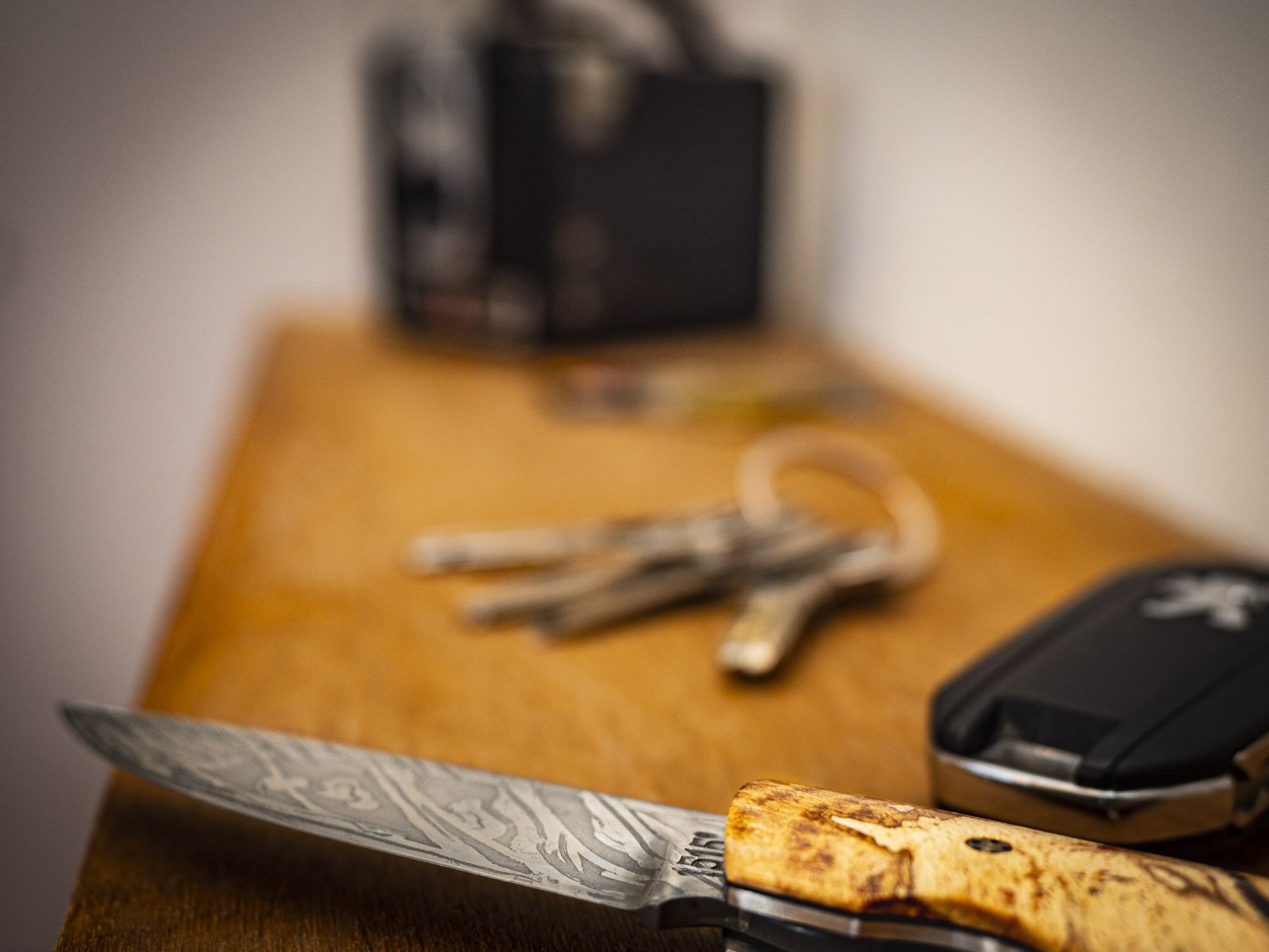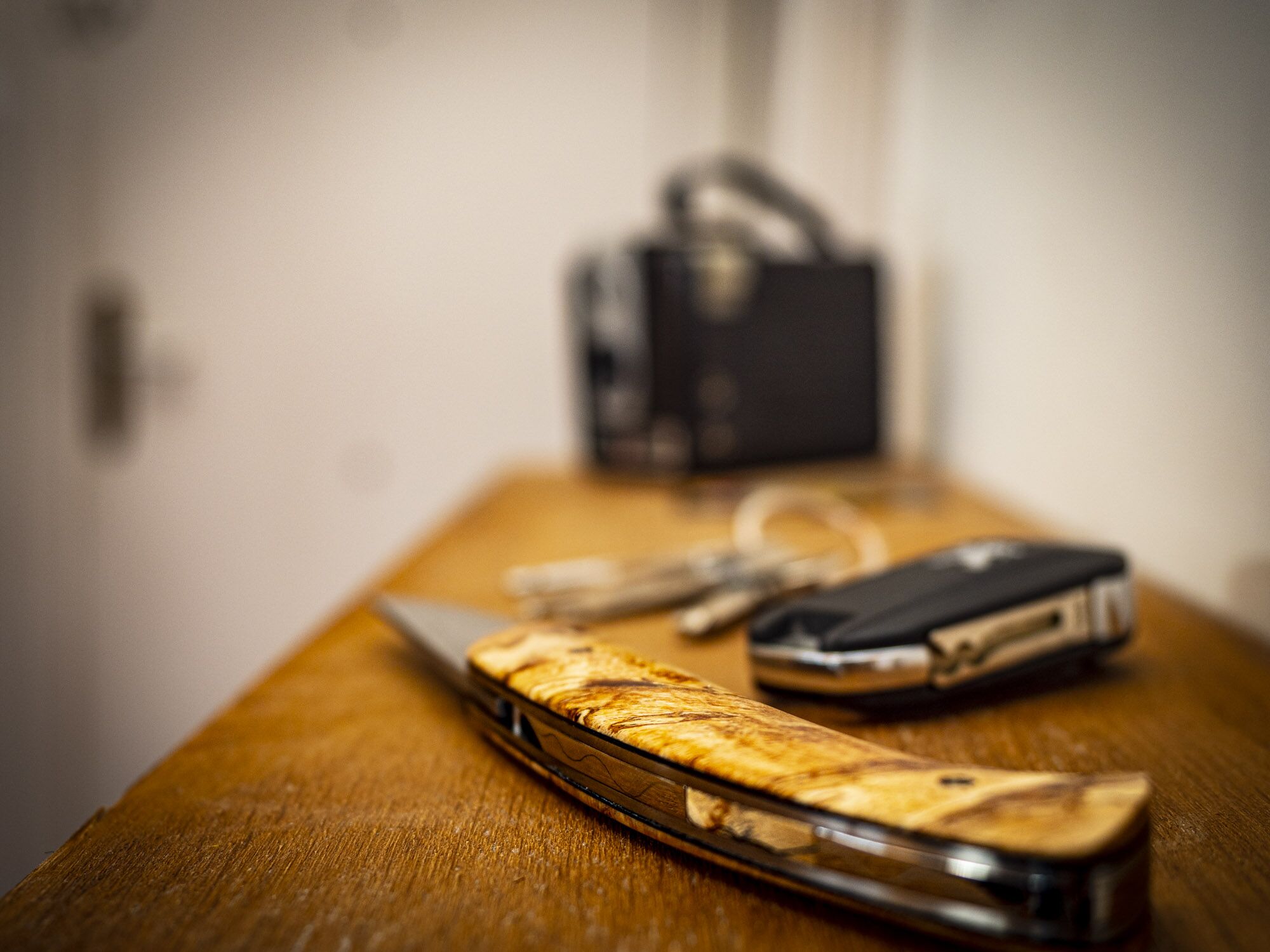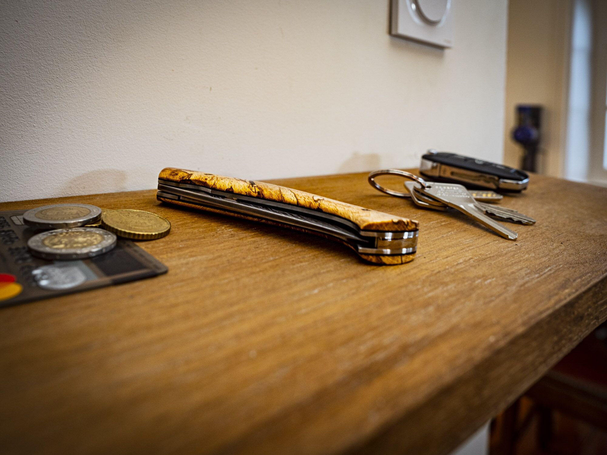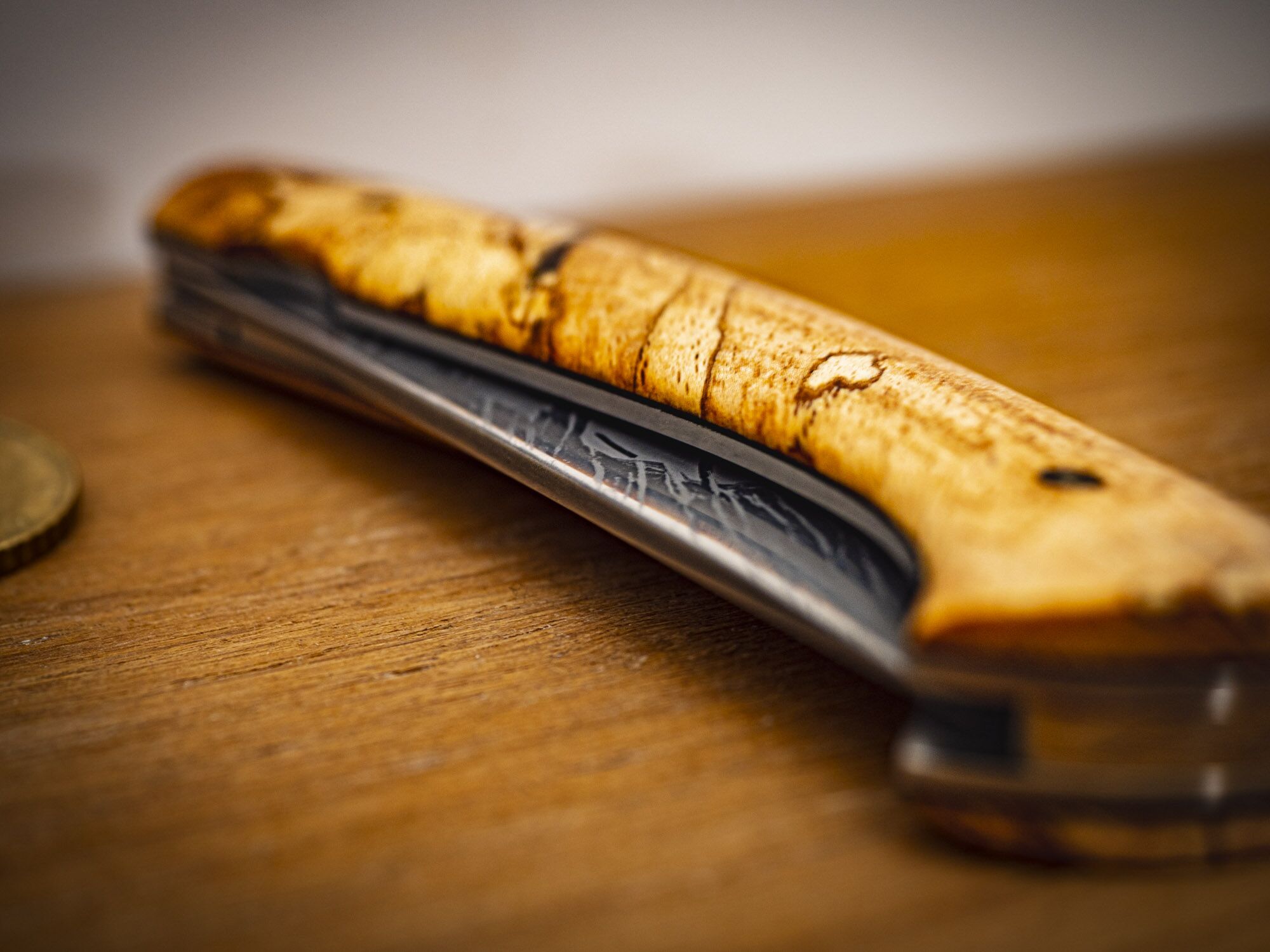 Le manche est en Hêtre échauffé. Les vis sont des ST Dupont mordorée. La lame en 14C28 oxydée eau forte. L’entretoise voyage avec insert bois.