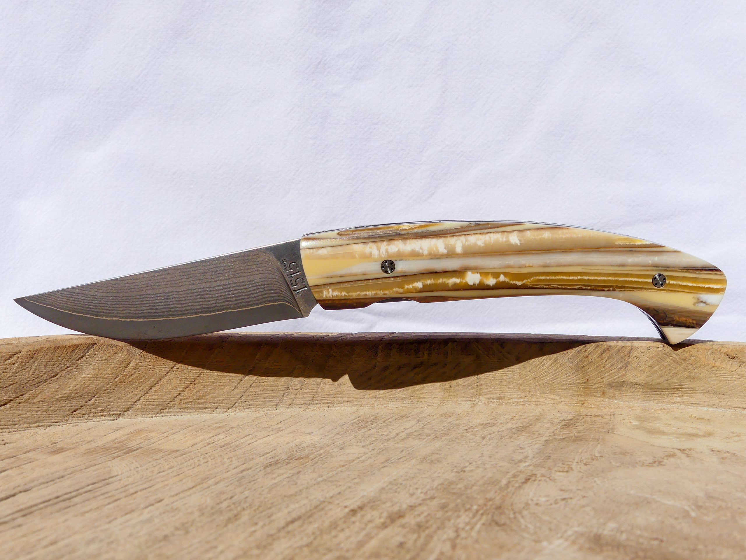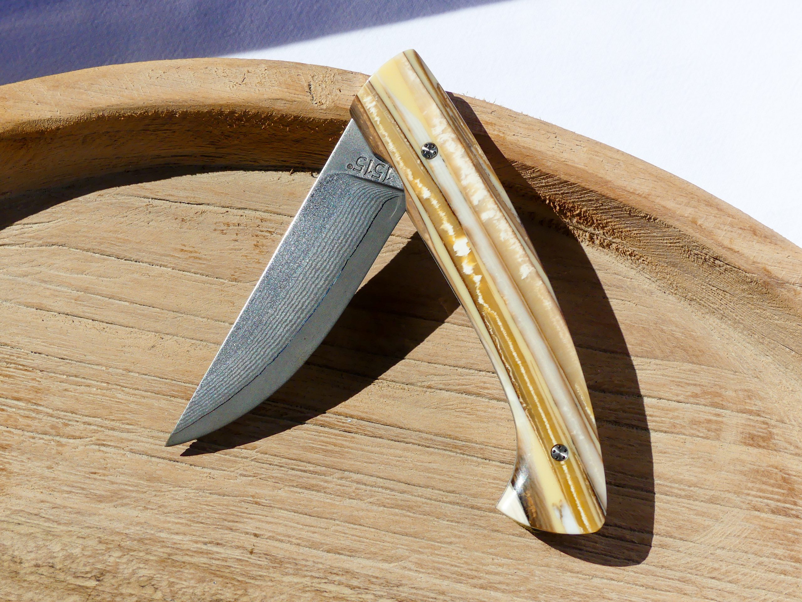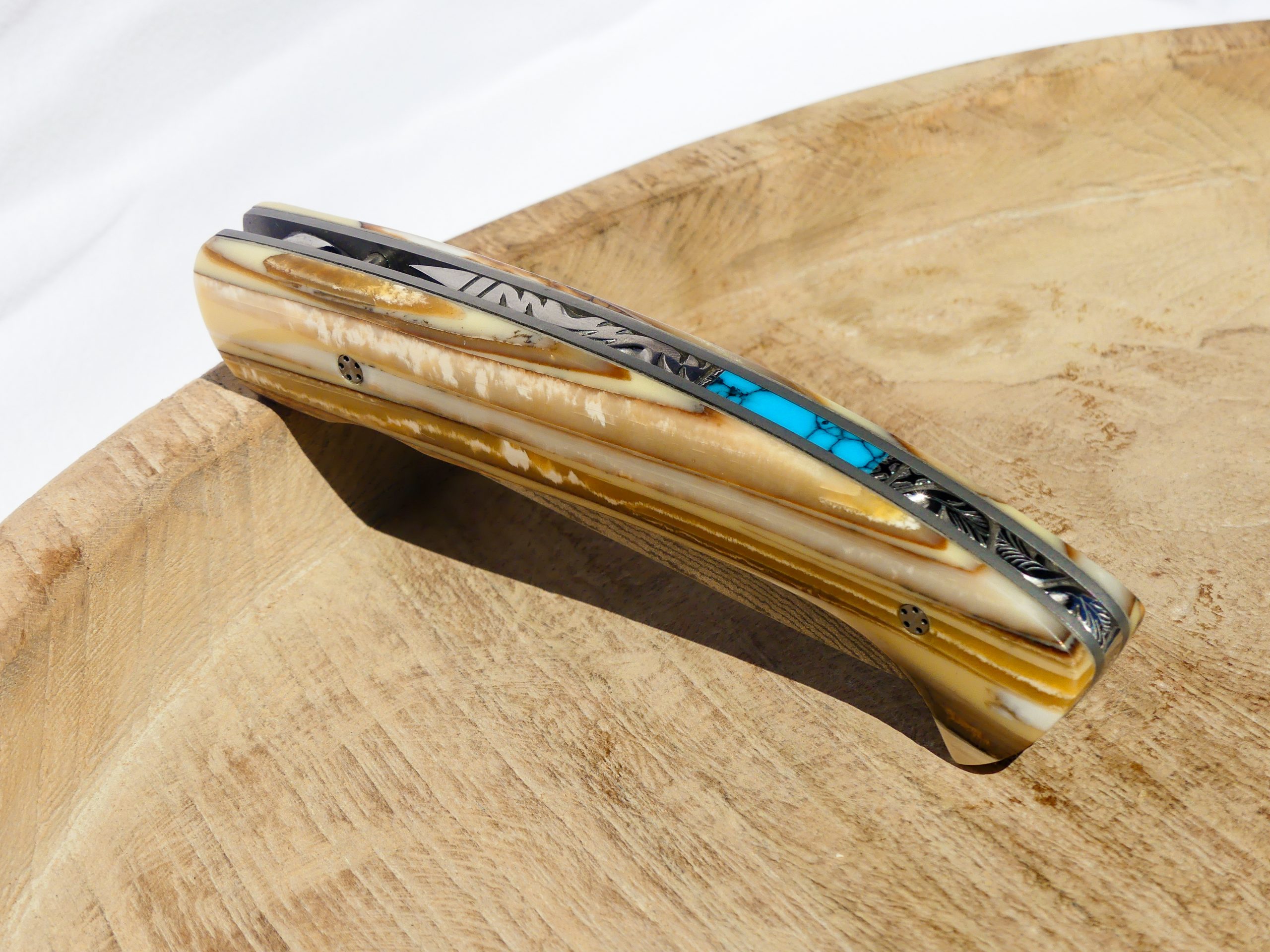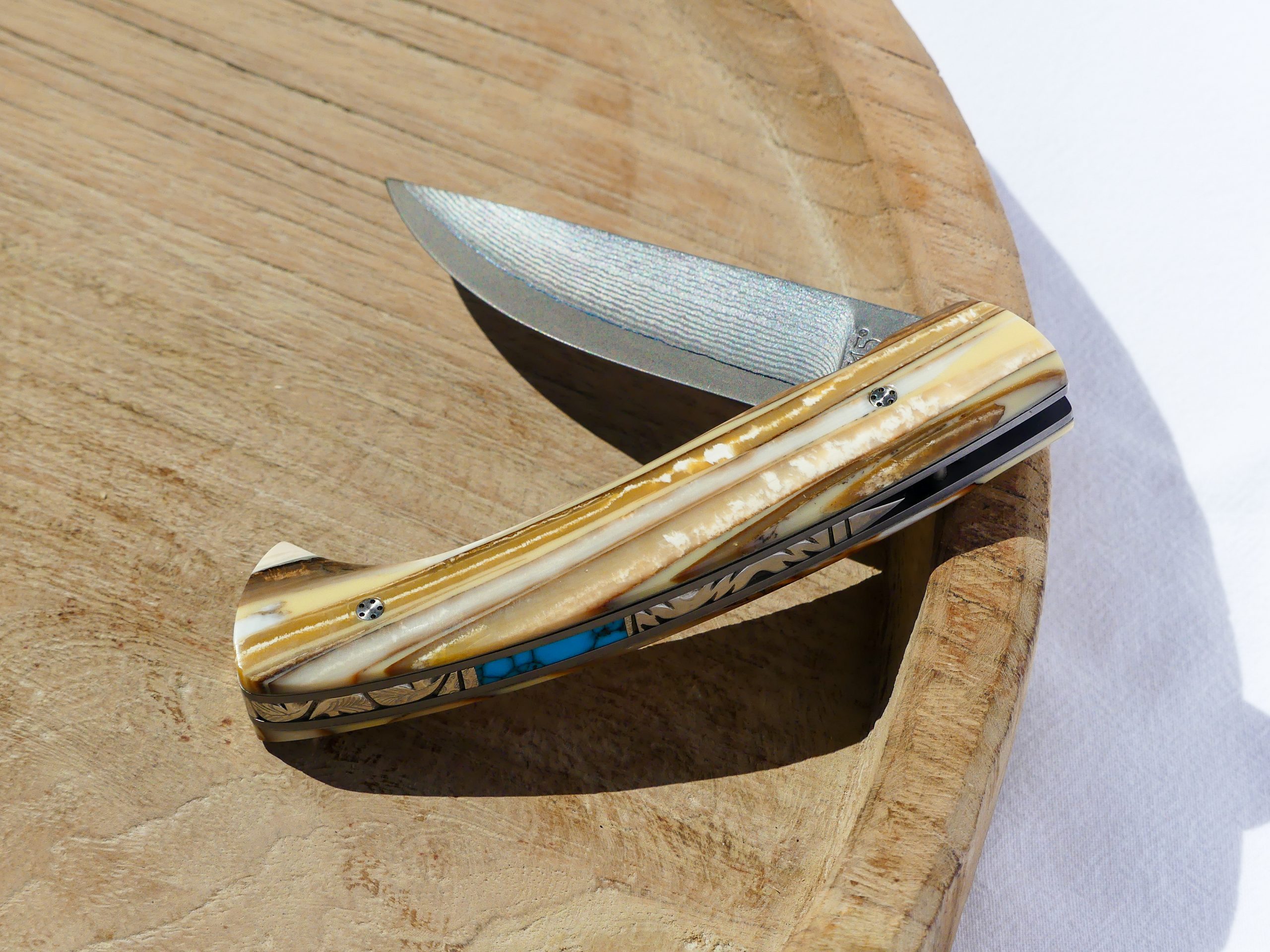 Système Liner-lock. C’est un plein manche en ivoire de Mammouth Stegodon d’environ 10000 ans en résine.