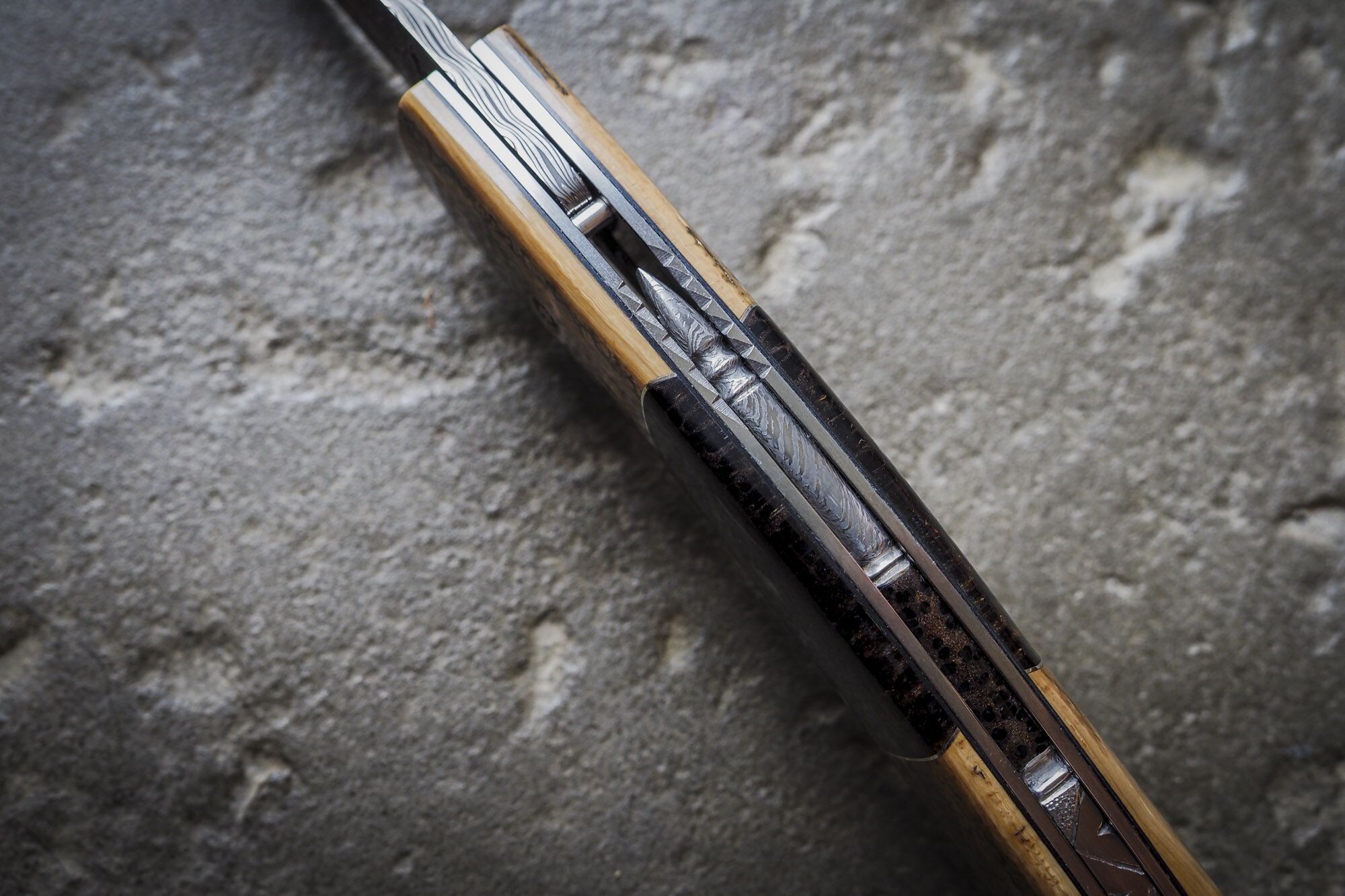 L’entretoise est en damas, en forme de flèche, possède un insert en fémur de Mammouth et est gravée à l’intérieur d’une citation.