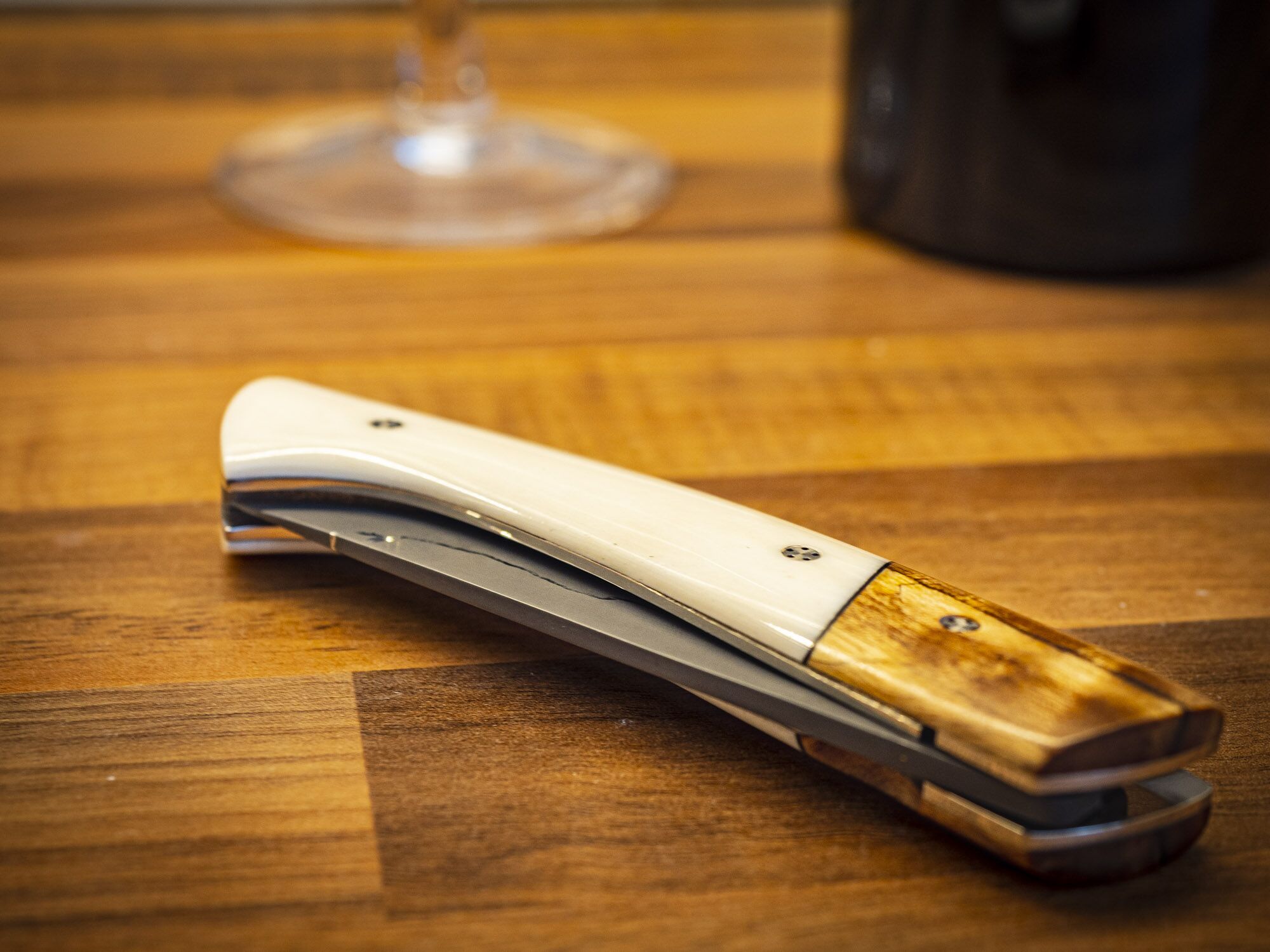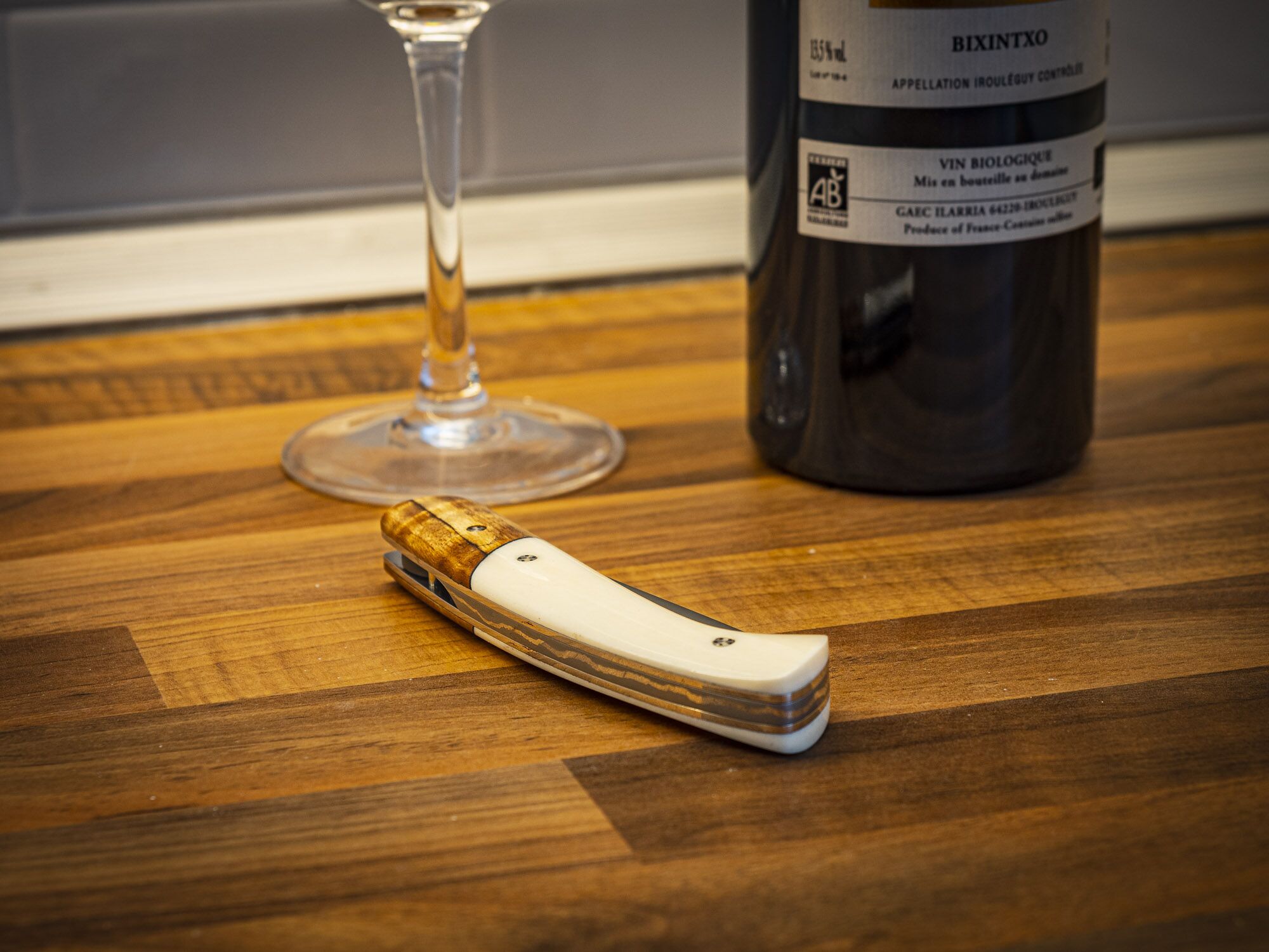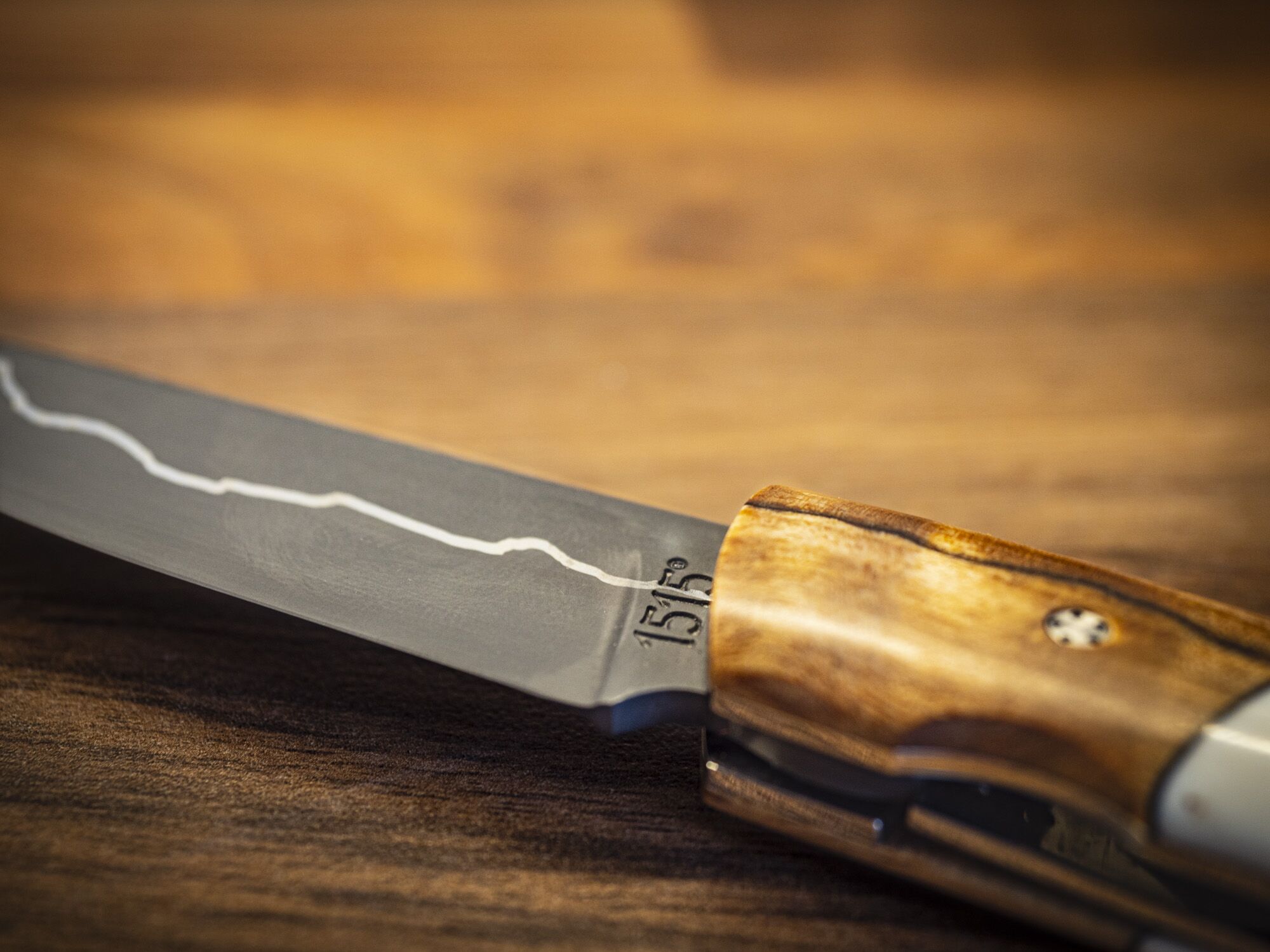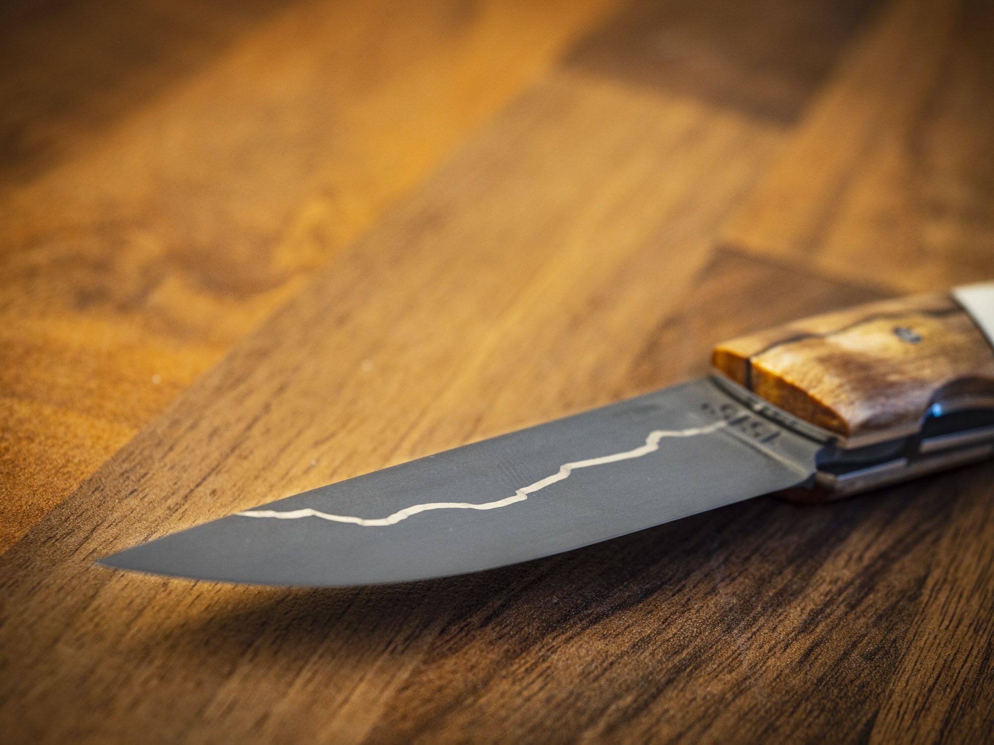 Le manche est en Hêtre échauffé et os de Buffle. Les vis sont des ST Dupont. La lame en 14C28N oxydée « Ligne de vie » en continuité de la veine du bois. L’entretoise voyage est gravée à l’eau forte.