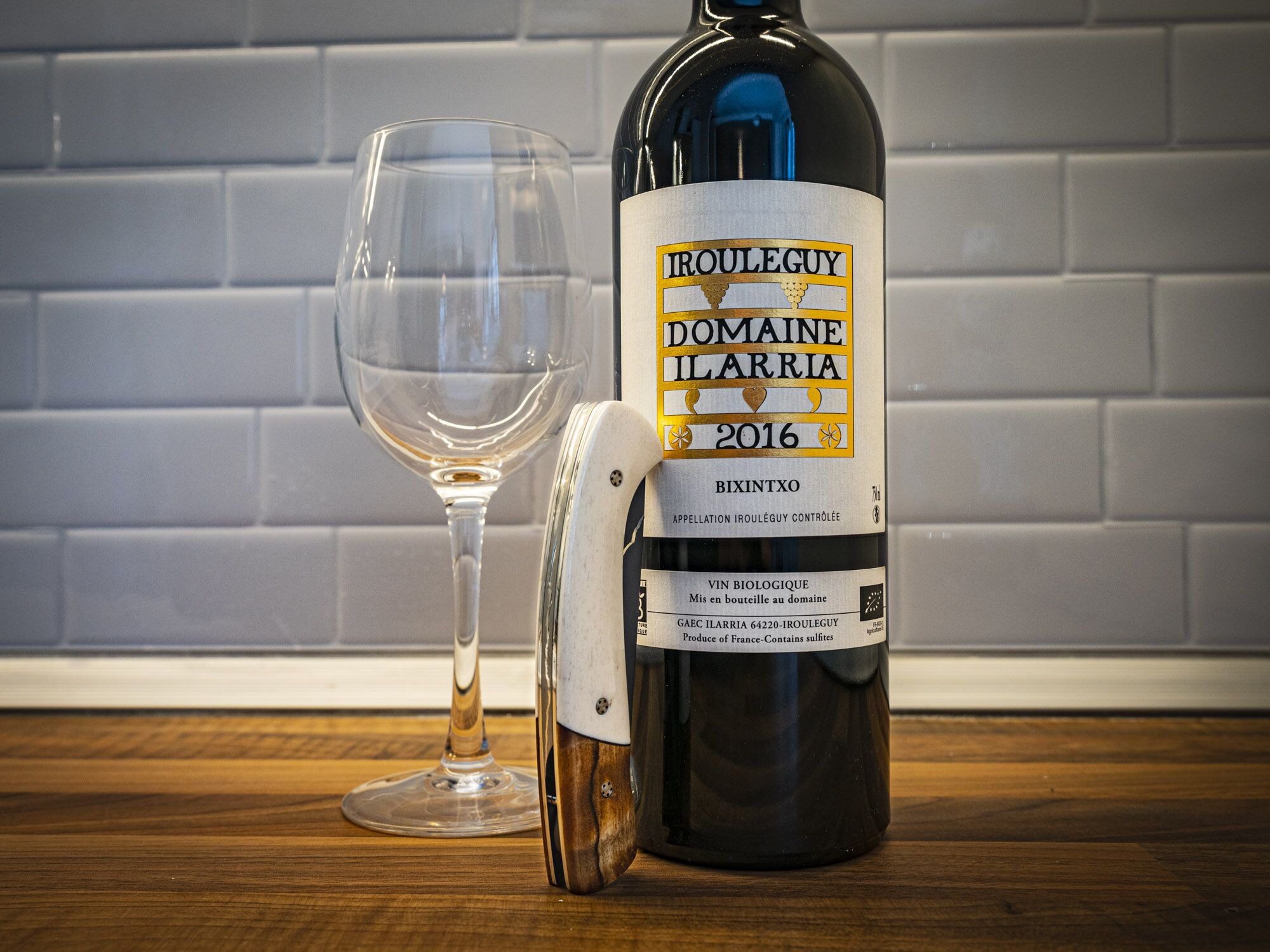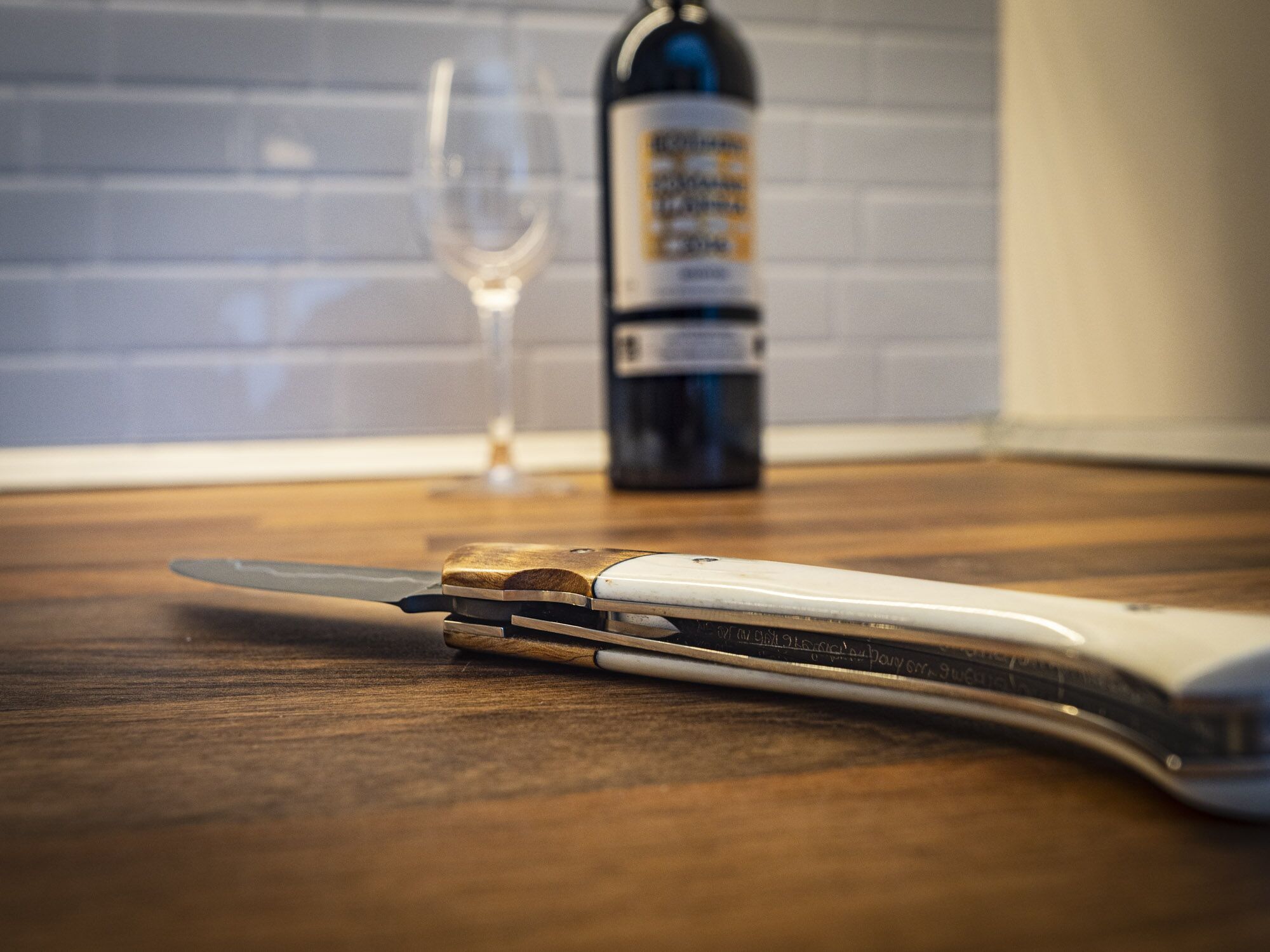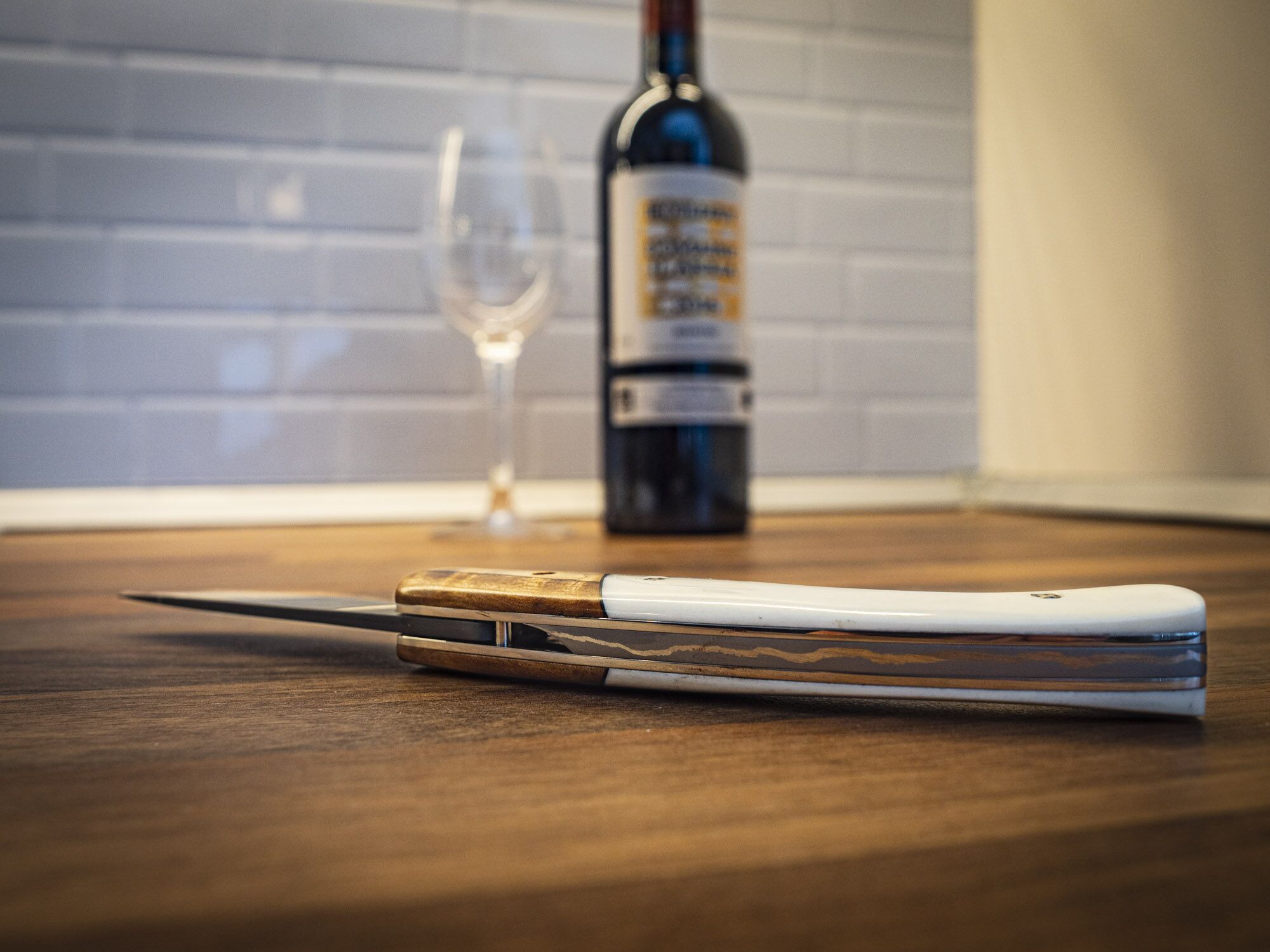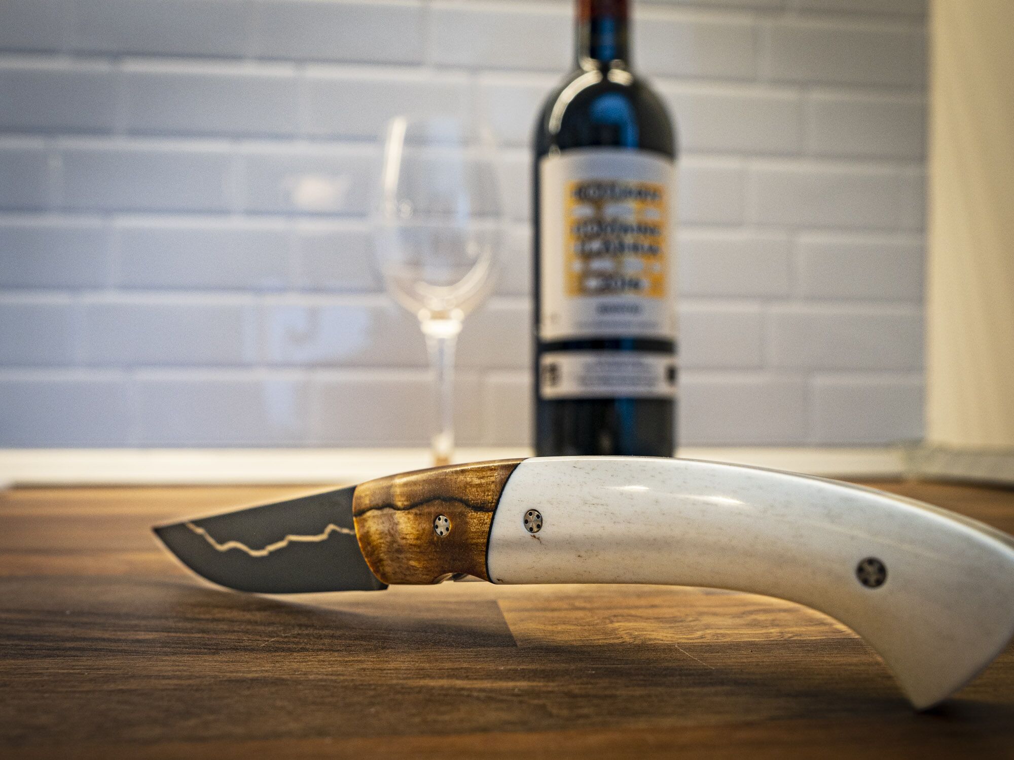 Le manche est en Hêtre échauffé et os de Buffle. Les vis sont des ST Dupont. La lame en 14C28N oxydée « Ligne de vie » en continuité de la veine du bois. L’entretoise voyage est gravée à l’eau forte.