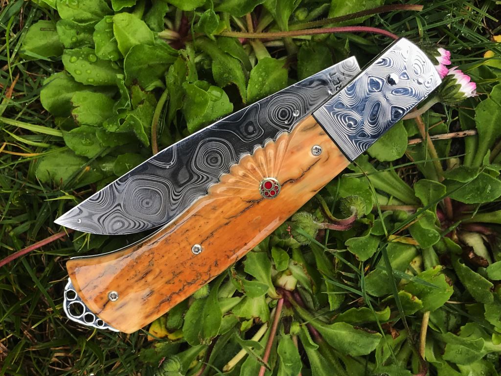 Sur ce couteau, modèle unique d’un Bourbonnais toutes les pièces ont été fabriquées à la main. Le manche est en croûte d’ivoire de Mammouth, les mitres sont en Damasteel Hakkapella. Le ressort est en acier inox Z20 guilloché au burin.