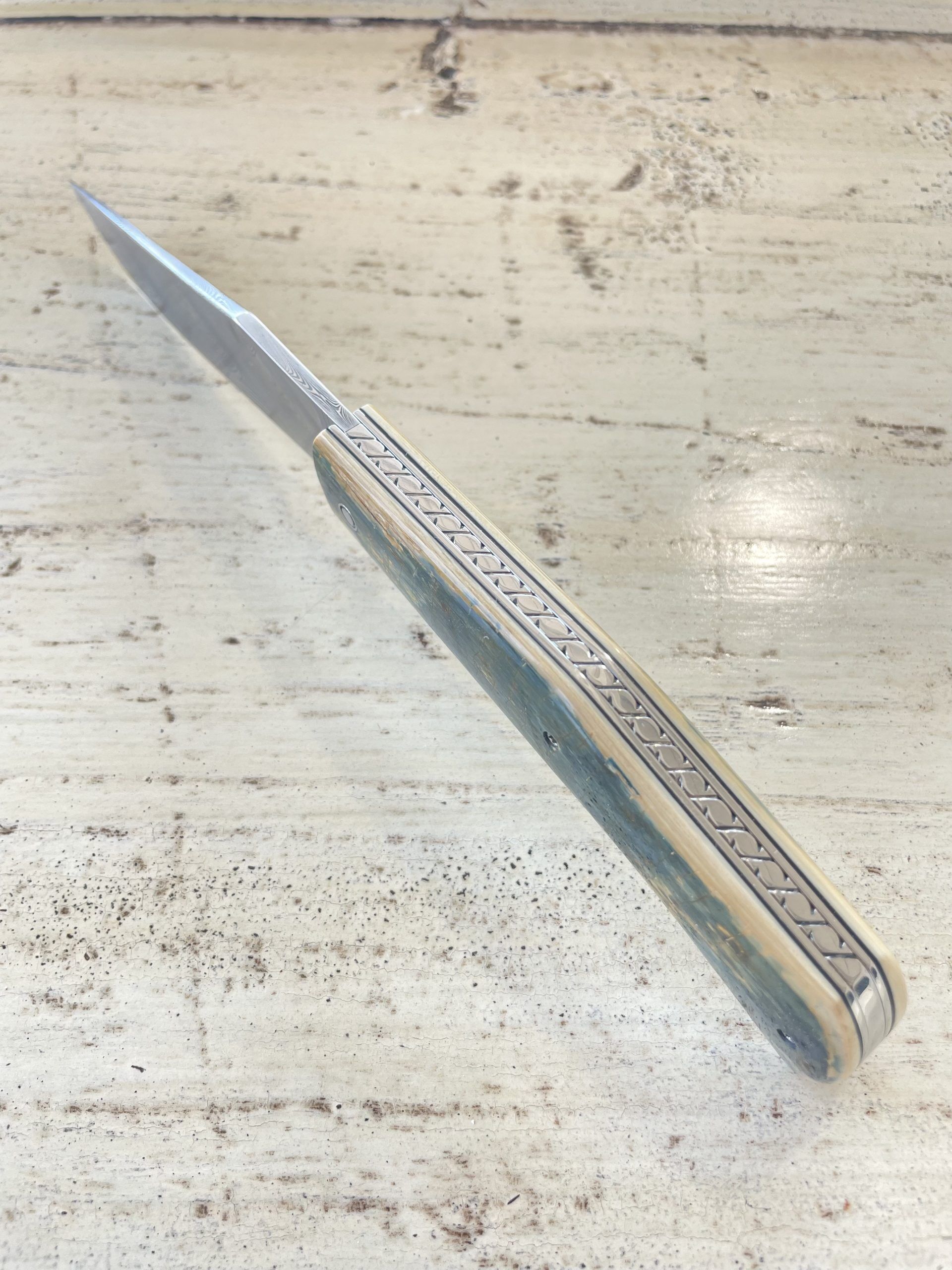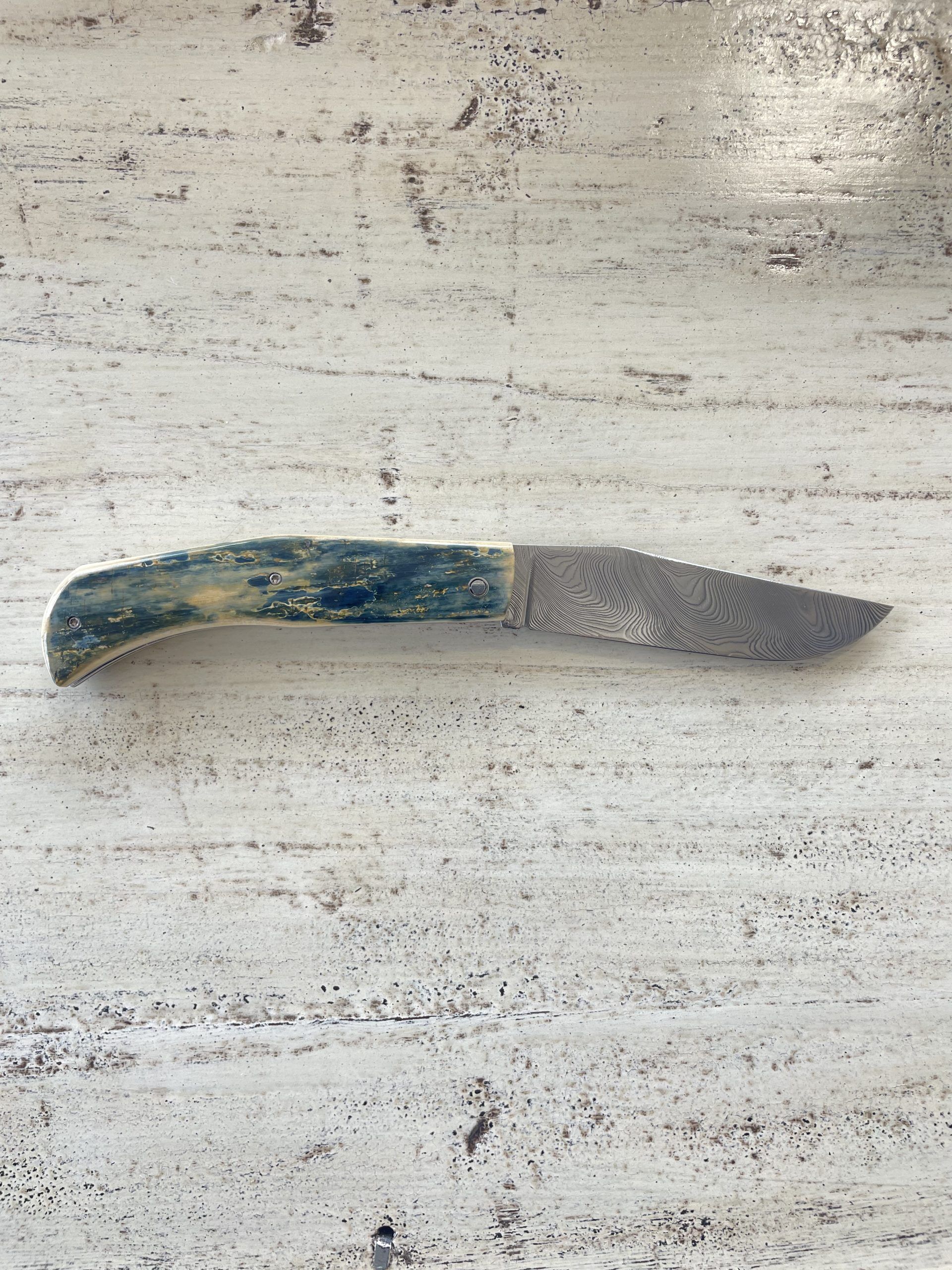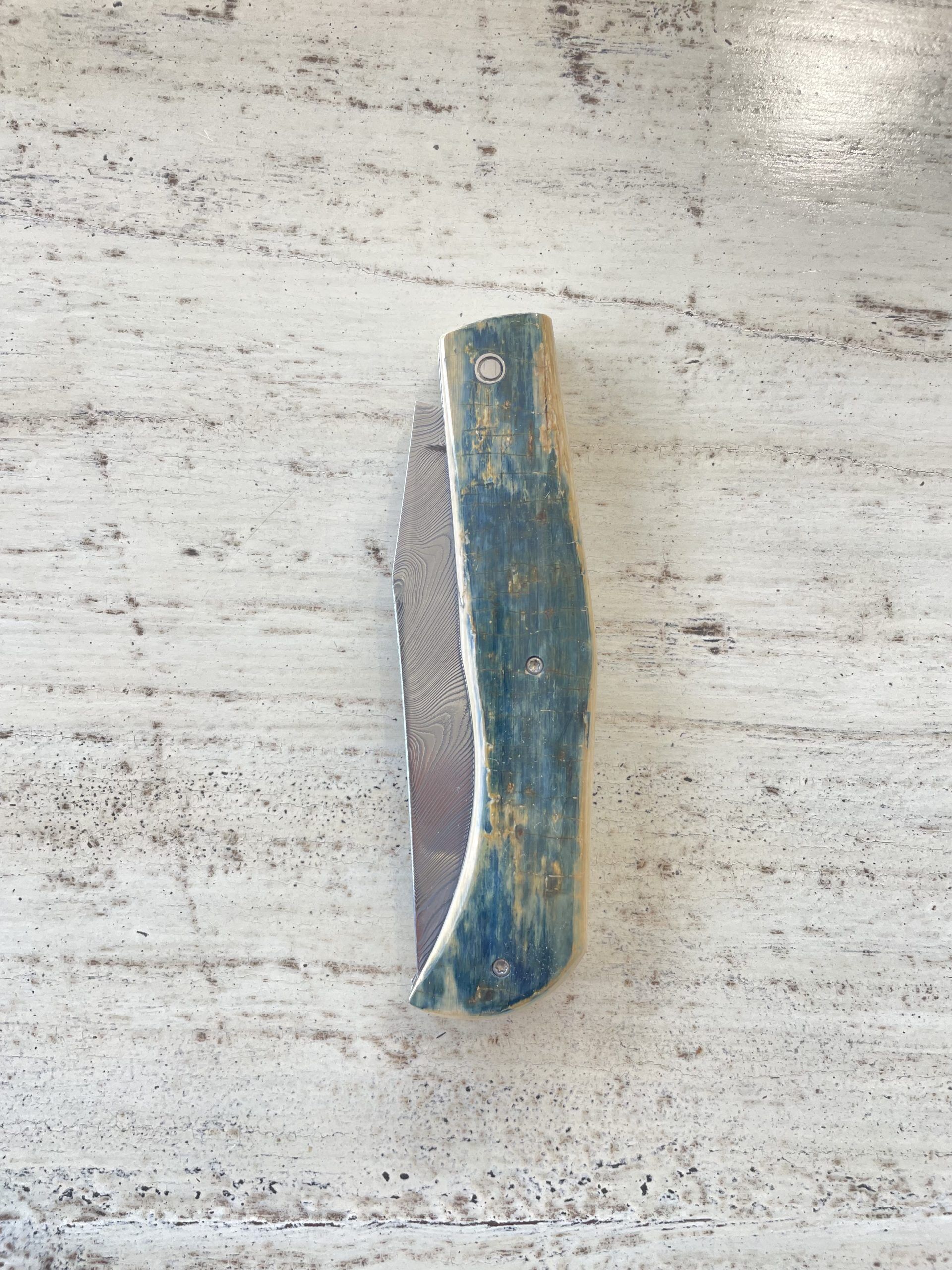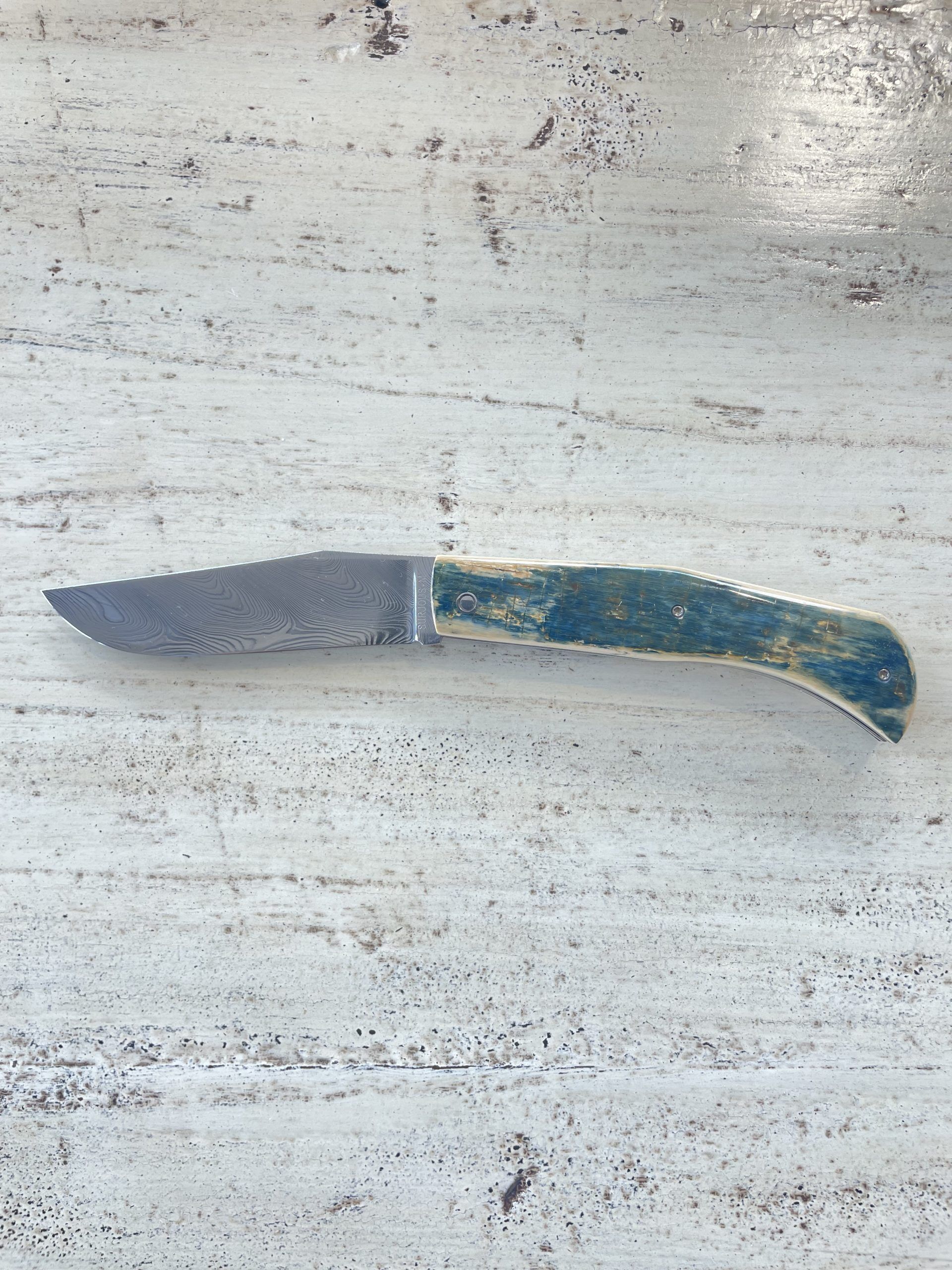 Il est composé d’un manche en croute de défense de mammouth bleu, d’une