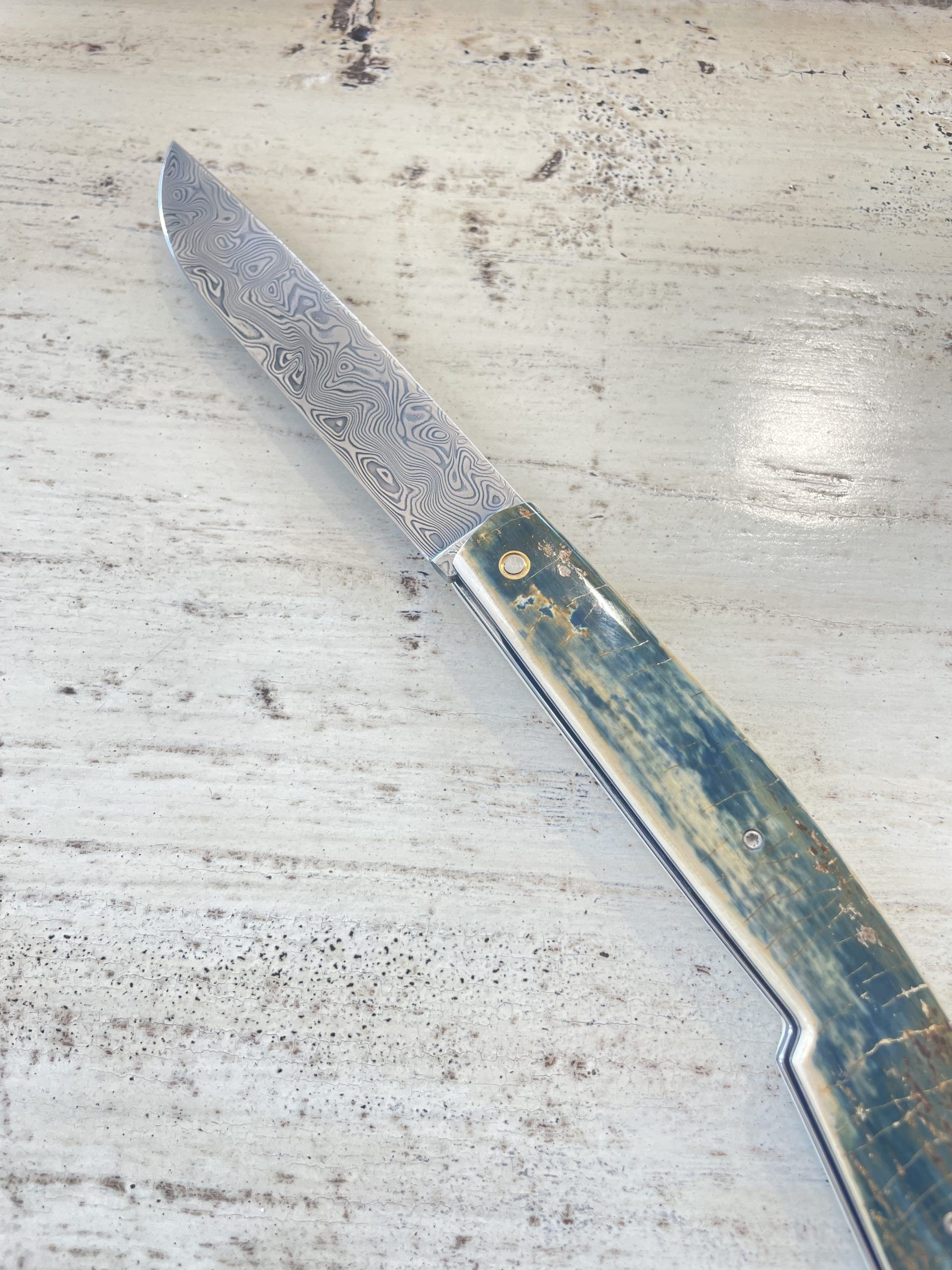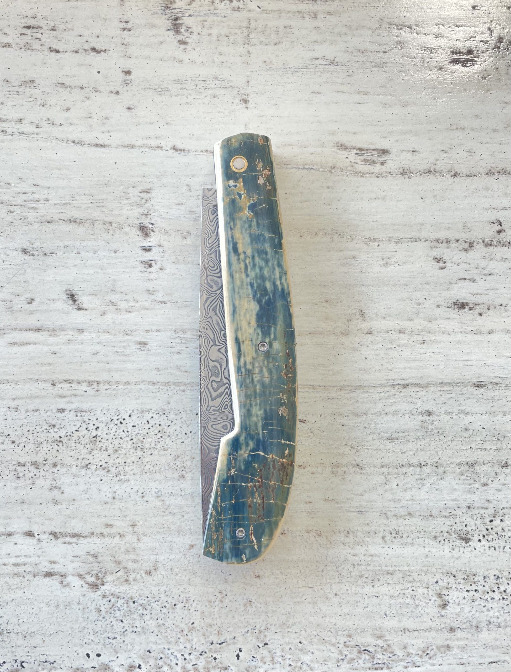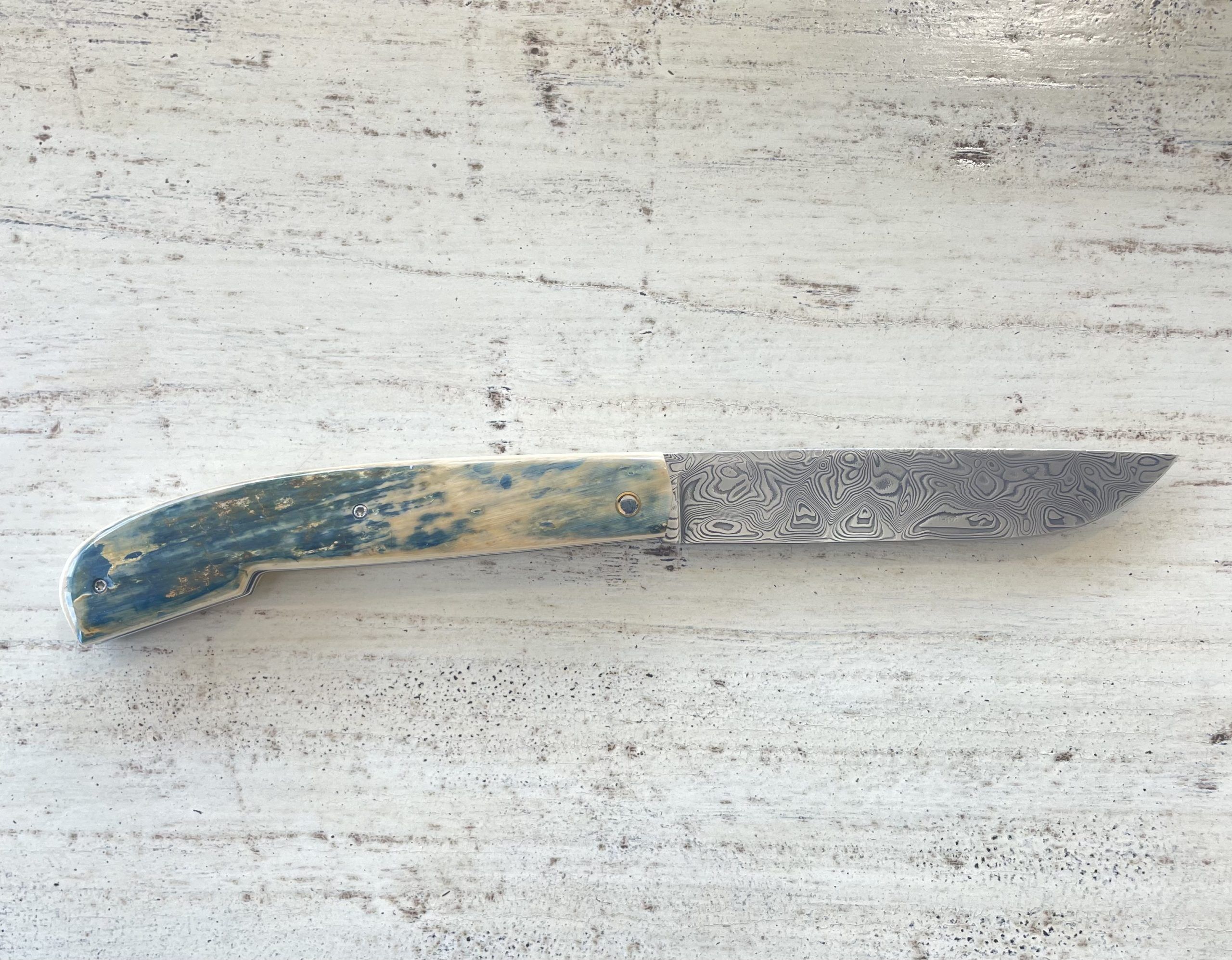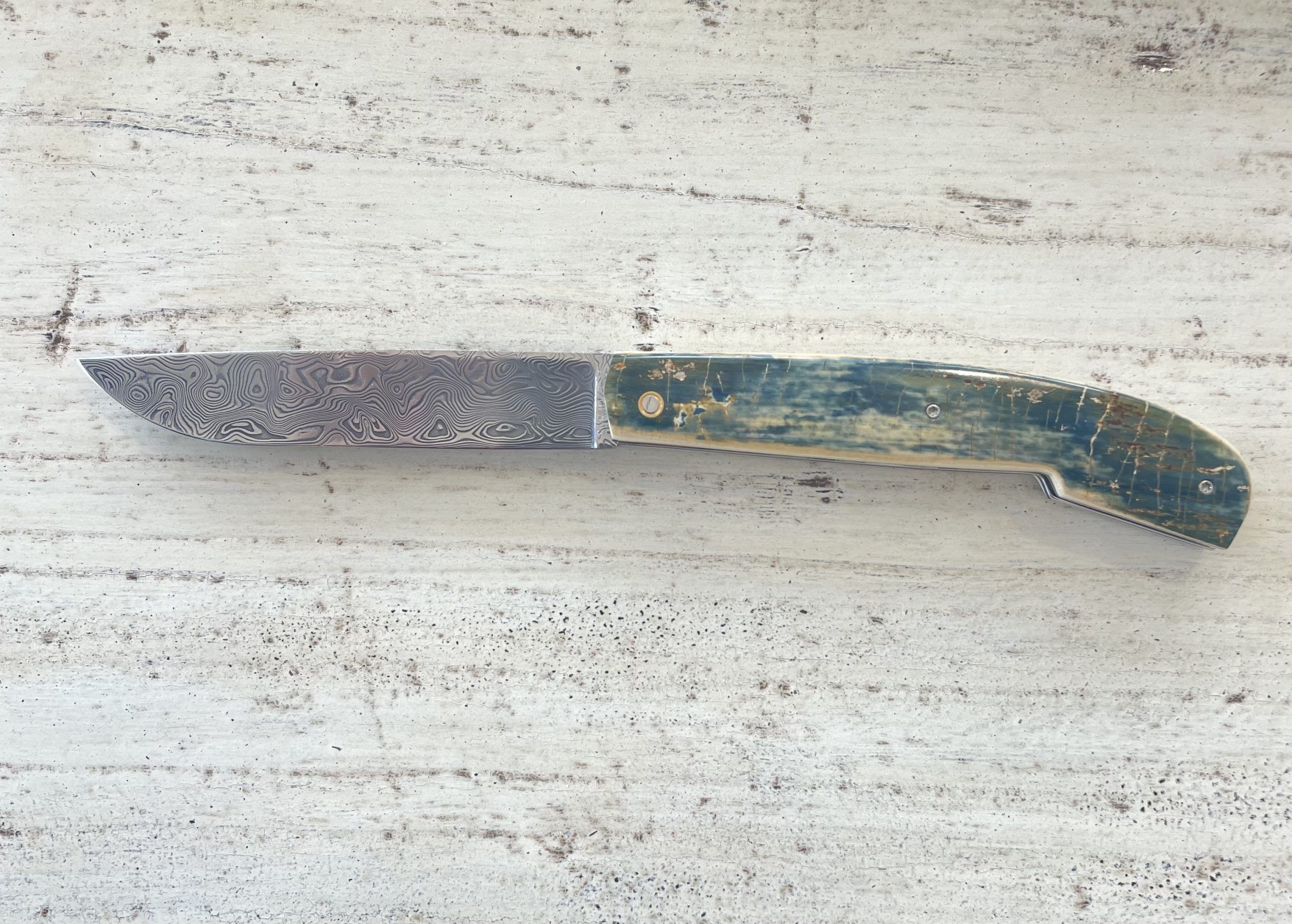 Il est composé d’un manche en croute de défense de mammouth bleu, d’une lame en damas inox (Vinland) avec une émouture en creux, d’un ressort en inox Z20C13 guilloché a la lime et de platines en inox F17.